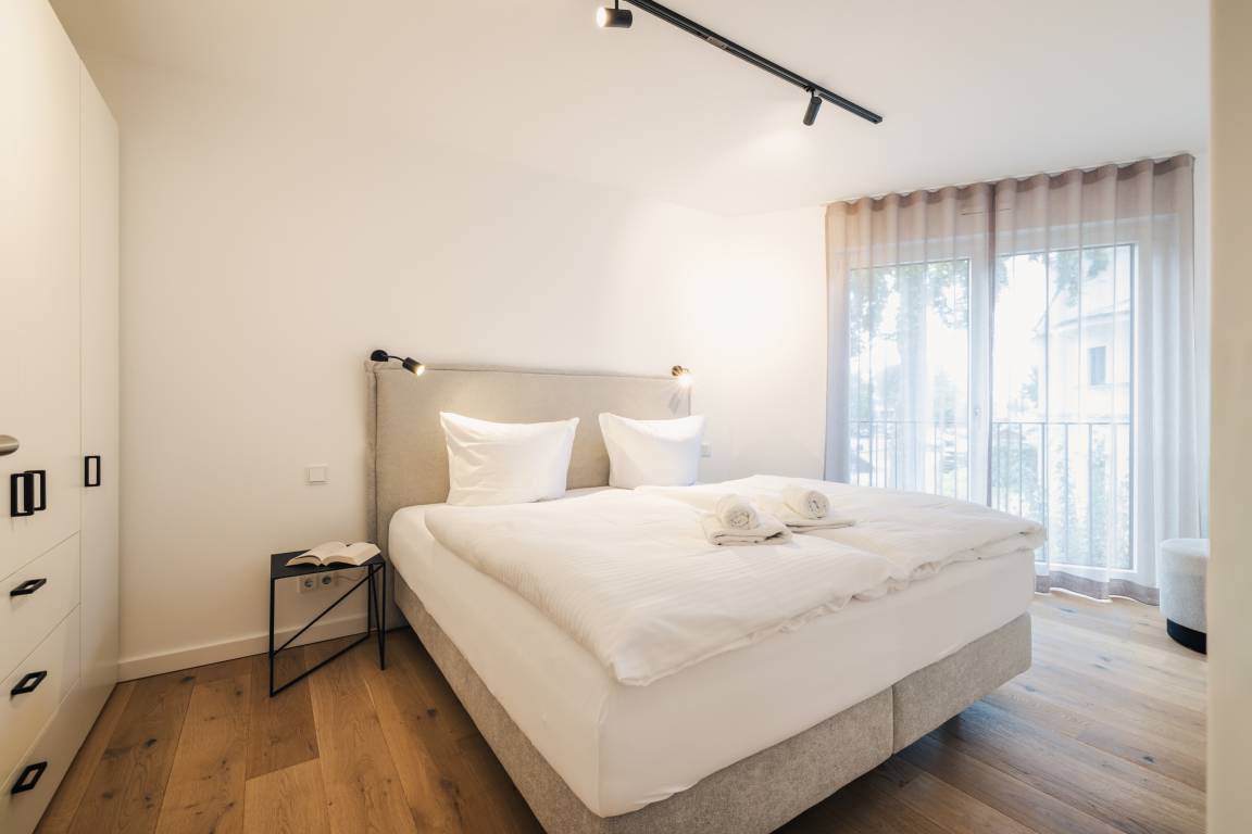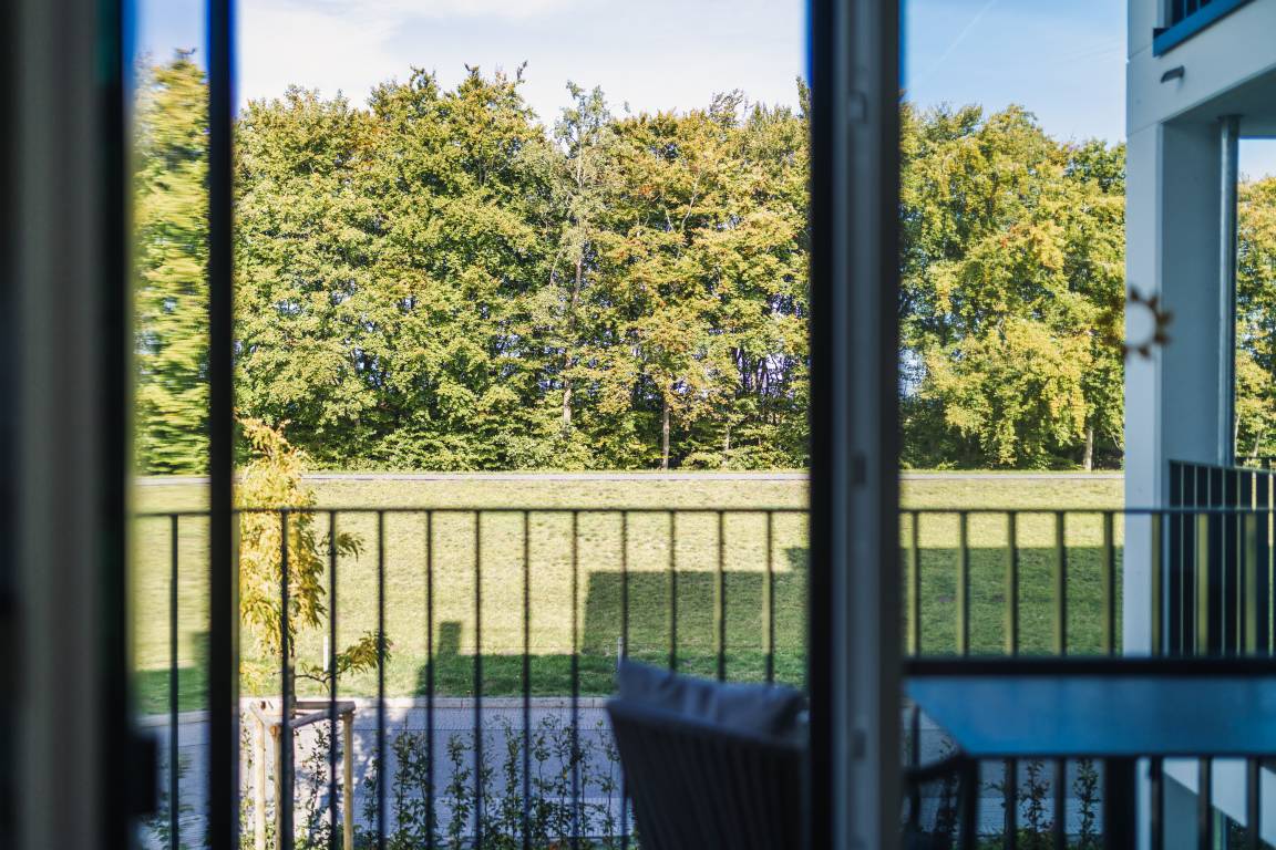 Großzügiger Wohnbereich mit bodentiefen Fenstern und Zugang zum Balkon – gemeinsam mit dem Schlafzimmer eröffnet sich hier ein schöner Platz im Freien zum Durchatmen und Genießen