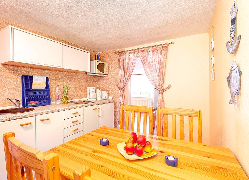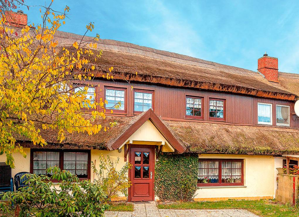 Haus: Gemütliche Reetdachhaushälfte mit 2 Ferienwohnungen. Gut erhaltenes, urtypisches Fischerhaus von 1920, deshalb teilweise eingeschränkte Stehhöhe (1,87 m). Freundliche Einrichtung. Kostenloser Internetzugang über W-Lan. Zentralheizung. Terrasse mit Sitzmöbeln. Umzäuntes Gartengrundstück. 2 Pkw-Stellplätze am Haus.