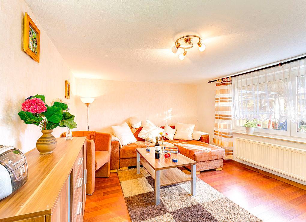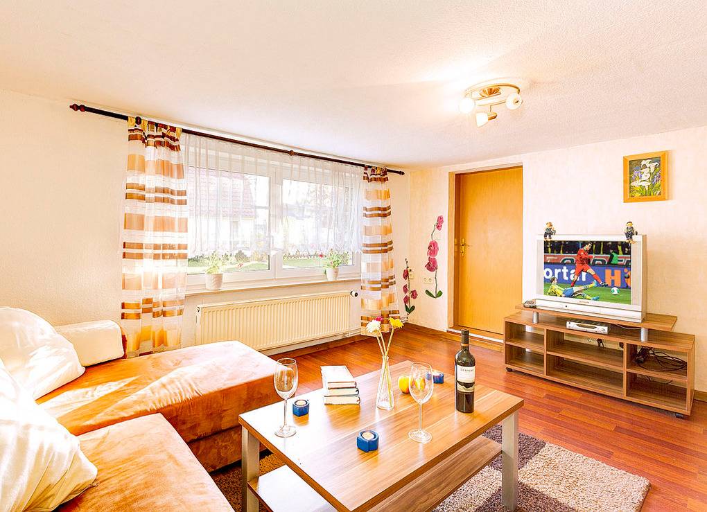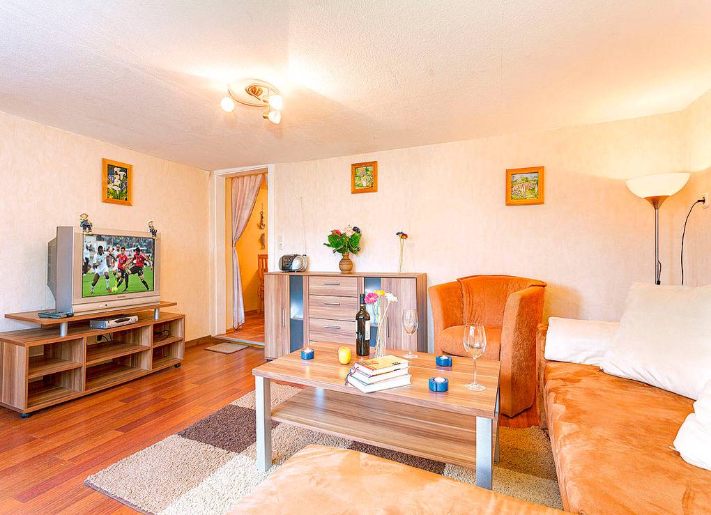 D 67.85 Wohnung 1-4 Pers.: 2 1/2-Zimmerwohnung mit 60 qm Wohnfläche, Parterre. Gemütlicher Wohn-/Schlafraum (eingeschränkte Stehhöhe 1,87 m) mit Couchgarnitur (Ausziehcouch 2 Pers.), Sat-TV, Radio/CD. Separate Küche mit Esstisch, kleiner Küchenzeile (2 Pl. E-Herd, Mikrowelle). 4-Bettzimmer mit Doppelbett, 2 Einzelbetten. Geräumiges Bad/WC. Hinweis: Die max. Belegung von 4 Personen darf nicht überschritten werden.