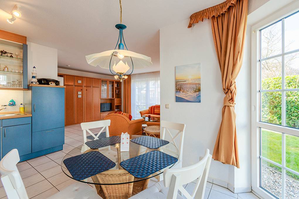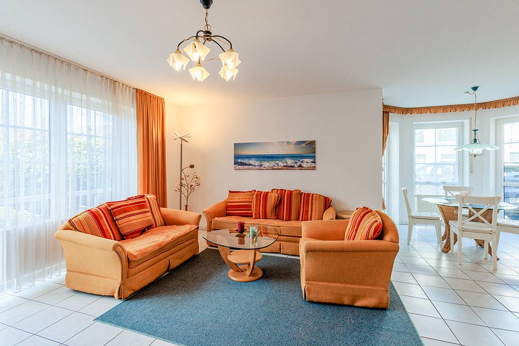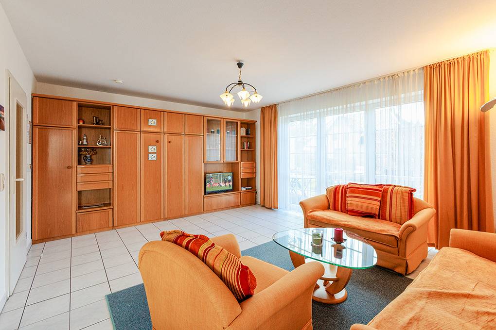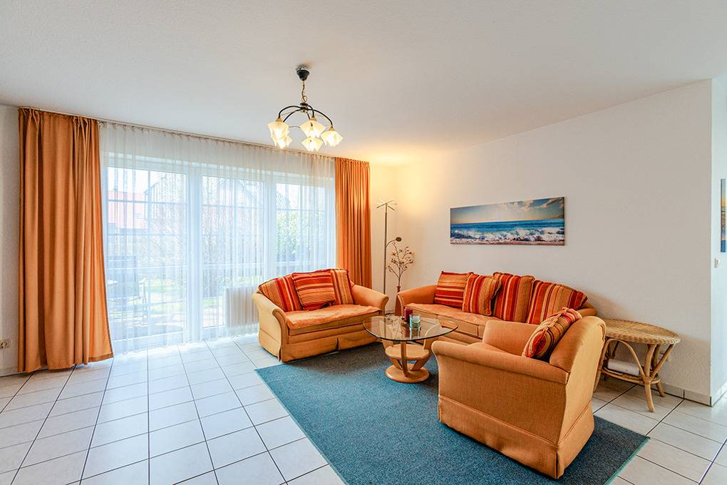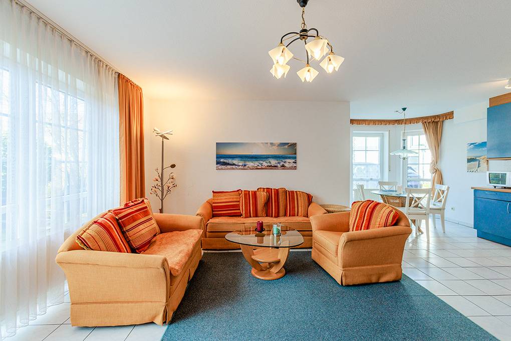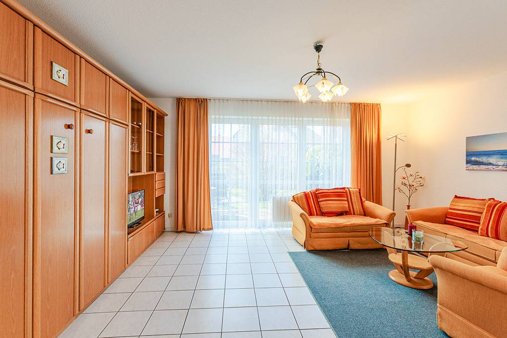 D 67.1910 Wohnung 1-4 Pers.: 2-Zimmerwohnung mit 57 qm Wohnfläche, Parterre. Großzügiger Wohn-/Essraum (34 qm) mit Couchgarnitur, Sat-TV, Schrankbett (2 Pers.), gemütlicher Sitzecke mit Esstisch in hellem Erker, Küchenzeile (Backofen, Mikrowelle, Spülmaschine). Doppelzimmer. Bad: Du, Wb, WC, Waschmaschine. Terrasse.