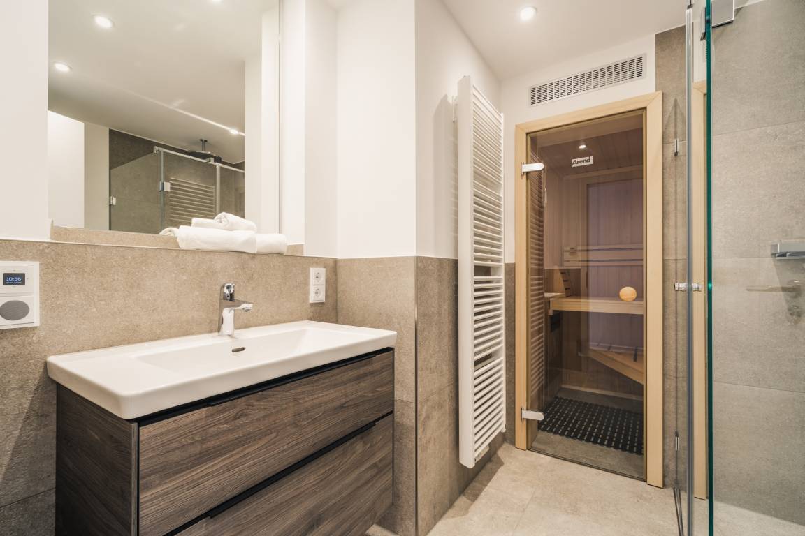 Modernes Bad mit ebenerdiger Dusche und Zugang zur privaten Sauna