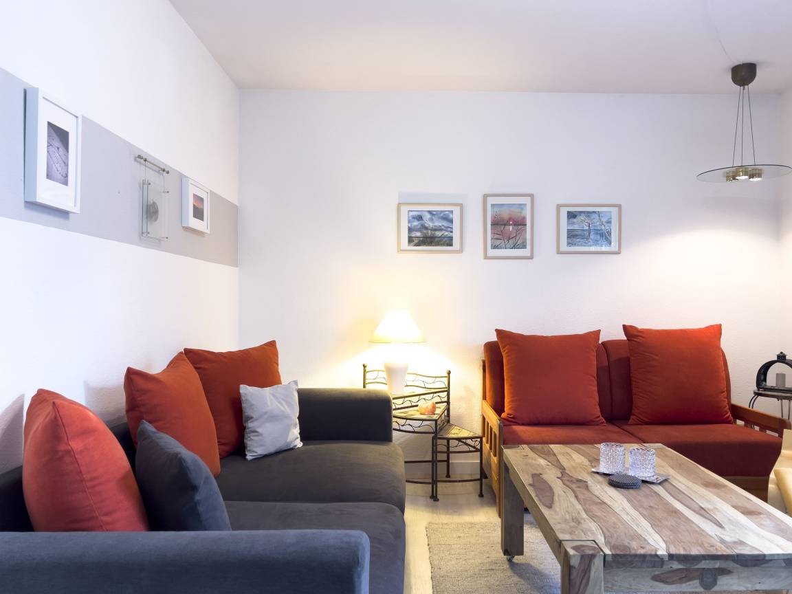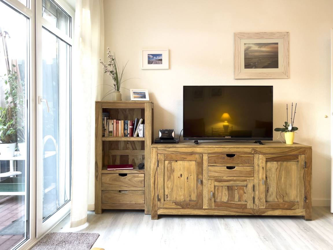 Wohnbereich: Heller Wohnraum mit bequemer Couch, Flachbild-TV und direktem Zugang zur Terrasse für entspannte Stunden.