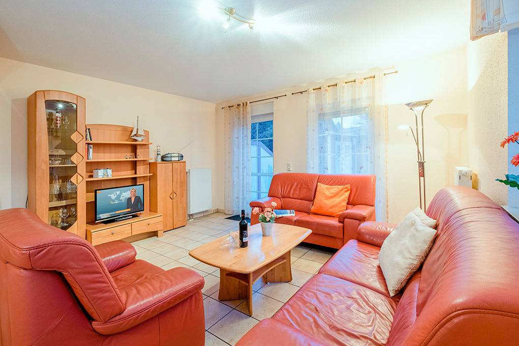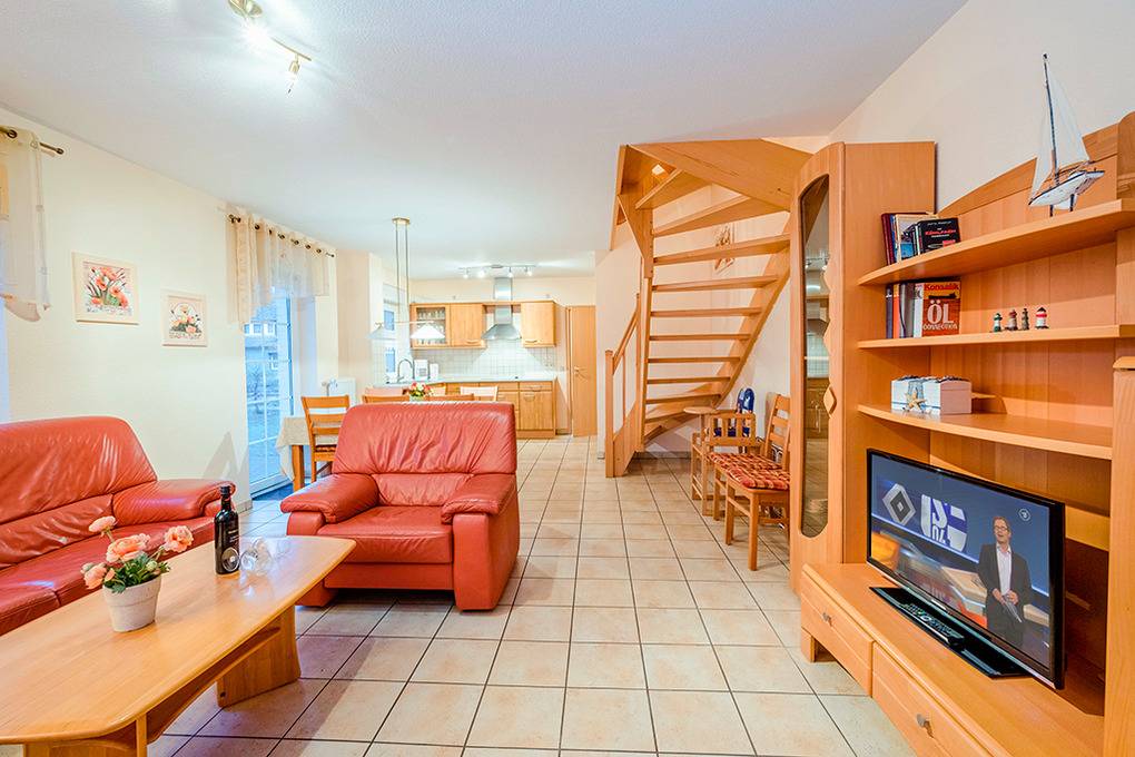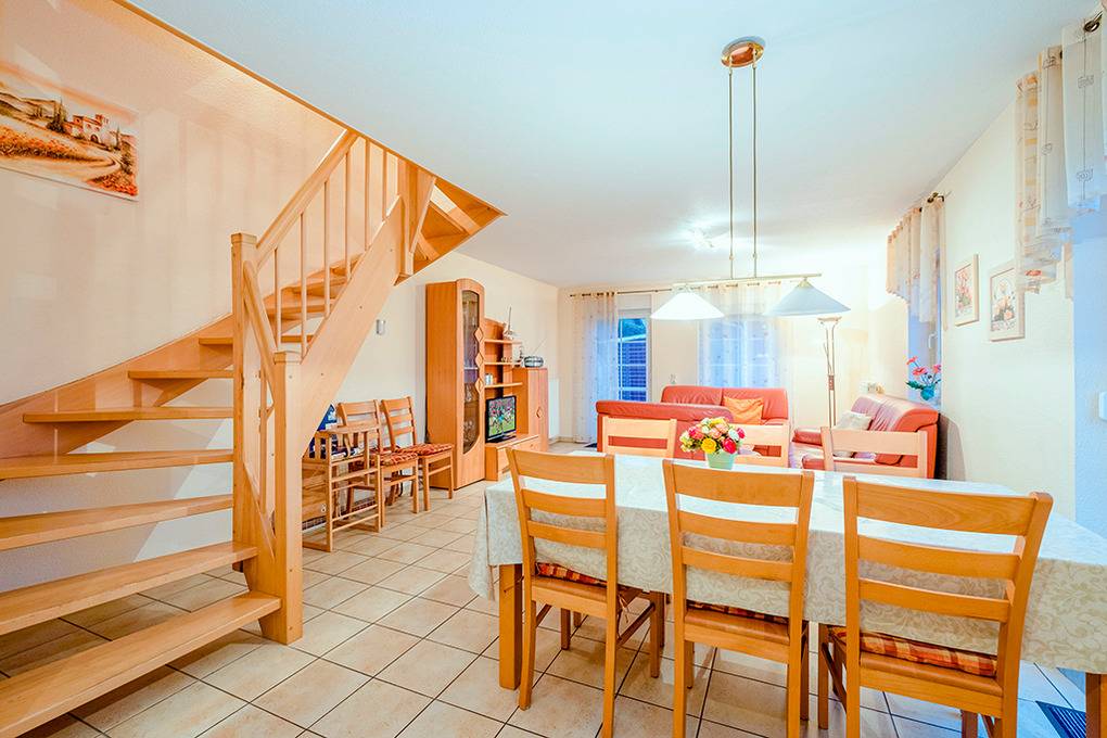 D 67.5404 Ferienhaus 1-6 Pers.: Schöne 4-Zimmerhaushälfte mit 85 qm über 3 Etagen. Nichtraucherhaus. Parterre: Großer, lichtdurchfluteter Wohnraum mit gemütlicher Couchgarnitur, Sat-TV, Esstisch, moderner Küchenzeile (Backofen, Spülmaschine). Bad/WC. 1. Etage: Zwei Doppelzimmer, eins davon mit Sat-TV. Bad/WC. Treppe in den Spitzboden: 2-Bettzimmer.