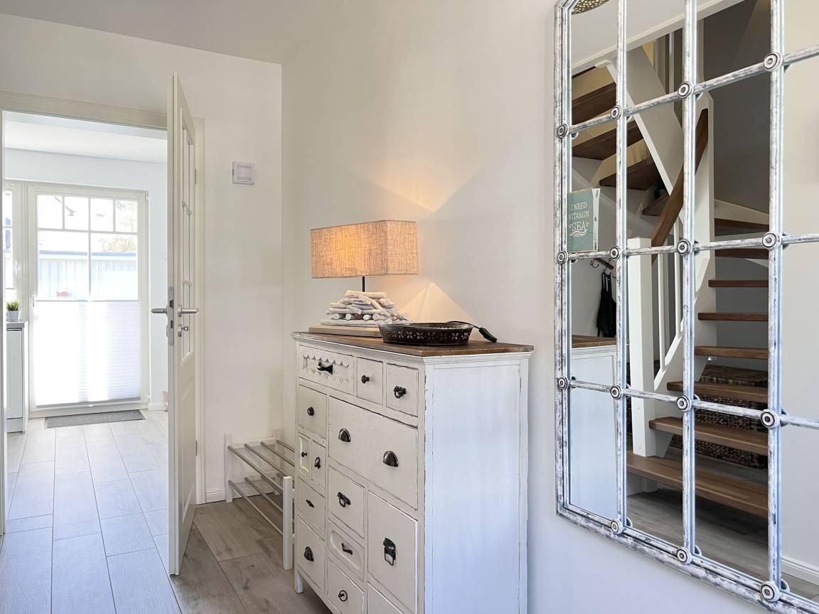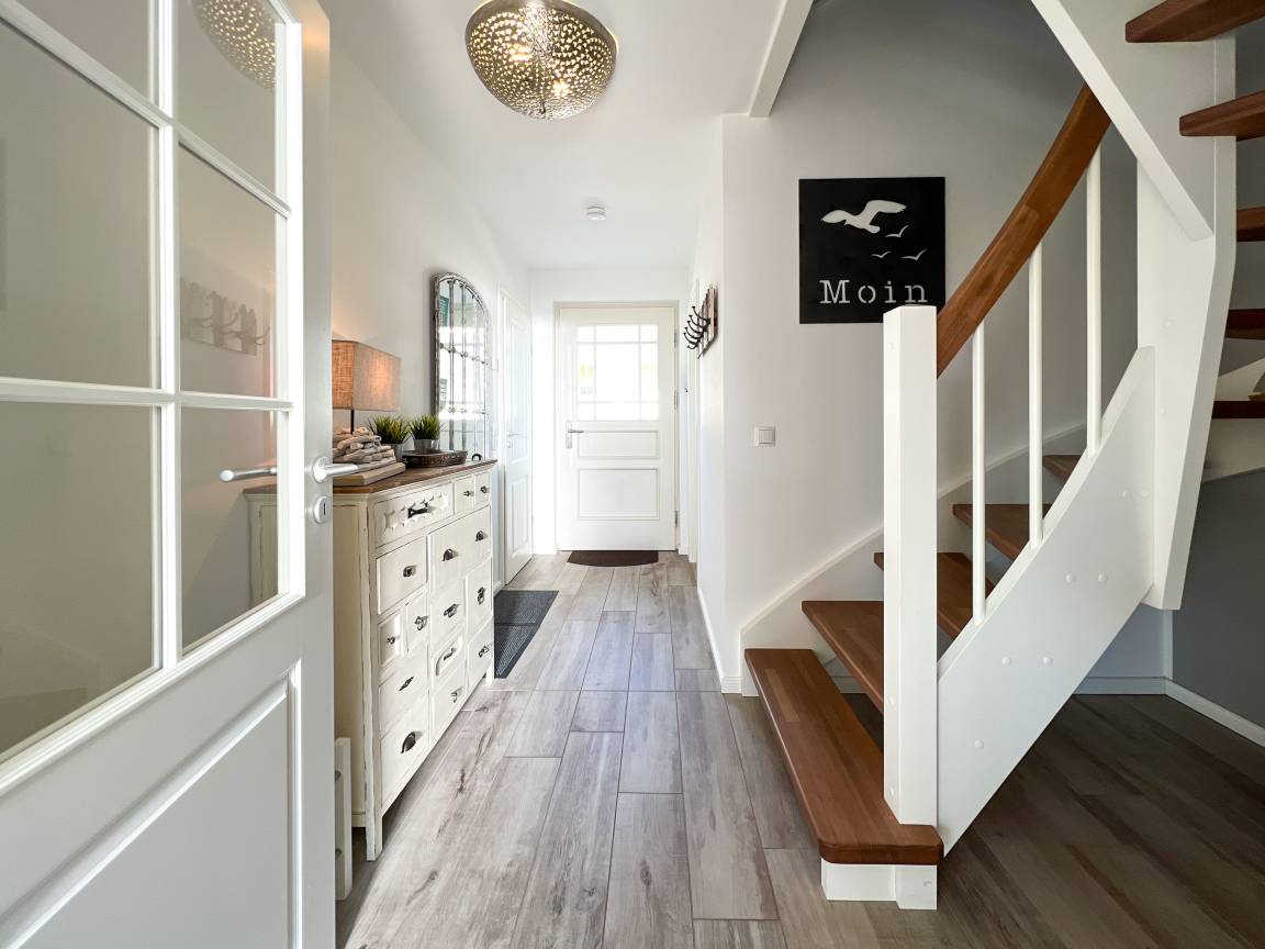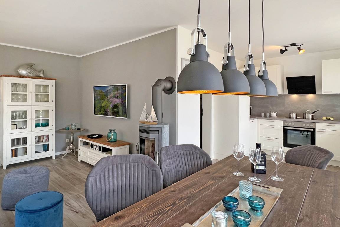 Das Dat Kroeger Hus empfängt Sie mit einer warmen und einladenden Atmosphäre. Der lichtdurchflutete Wohn-, Ess- und Küchenbereich im Erdgeschoss ist das Herz des Hauses und lädt zu entspannten Abenden ein – sei es bei einem guten Buch oder einem gemeinsamen Spieleabend. Die moderne Küche ist vollständig ausgestattet, sodass Sie mühelos köstliche Mahlzeiten für Ihre Liebsten zubereiten können.