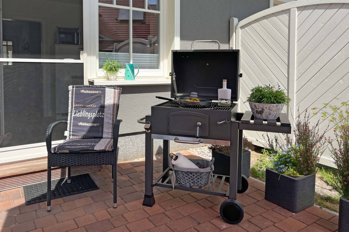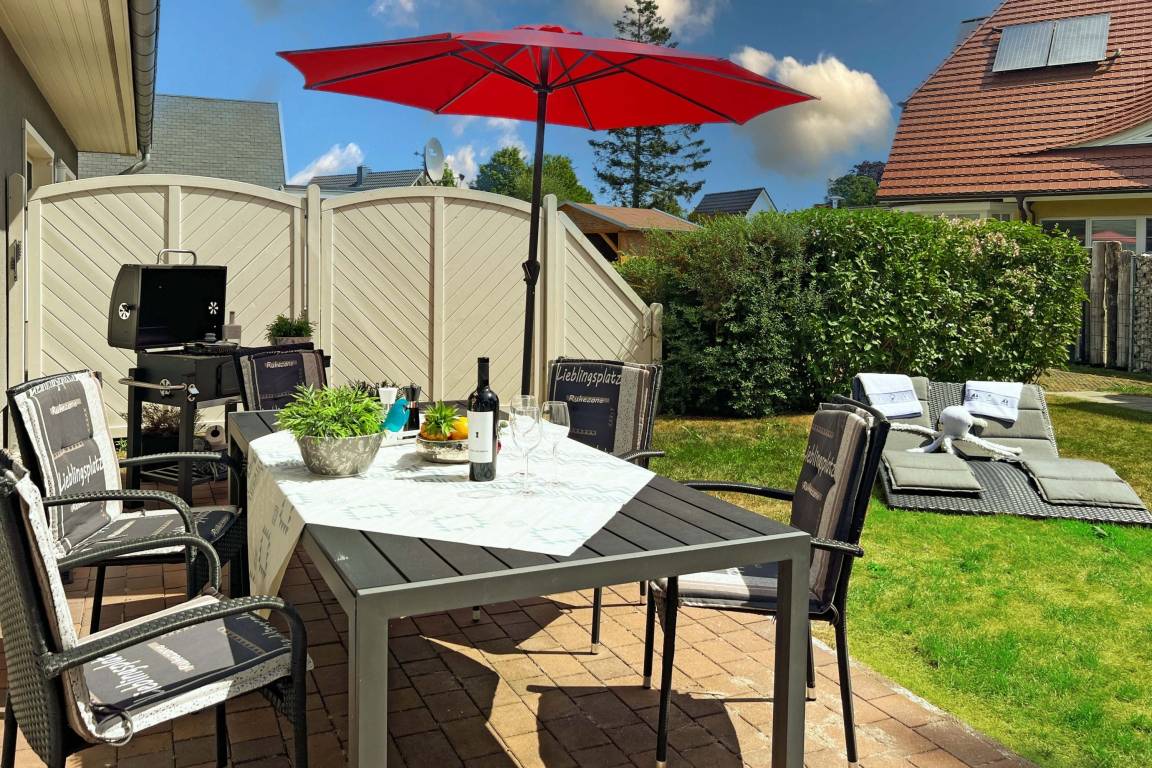 Nach einem erlebnisreichen Tag an der frischen Ostseeluft lädt die großzügige Südterrasse zum Verweilen ein. Starten Sie den Tag mit einem gemütlichen Frühstück im Freien oder genießen Sie abends die letzten Sonnenstrahlen auf den Relaxliegen. Der große Garten mit üppiger Rasenfläche bietet viel Platz zum Spielen und Entspannen – ein Paradies für Kinder und Erwachsene gleichermaßen.