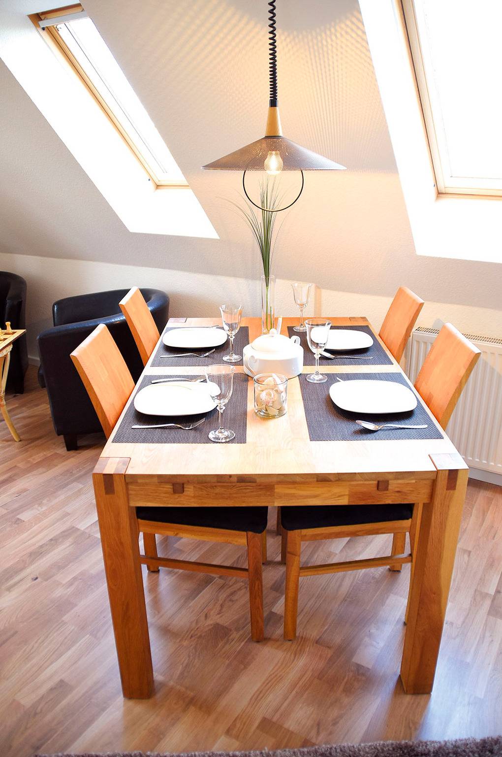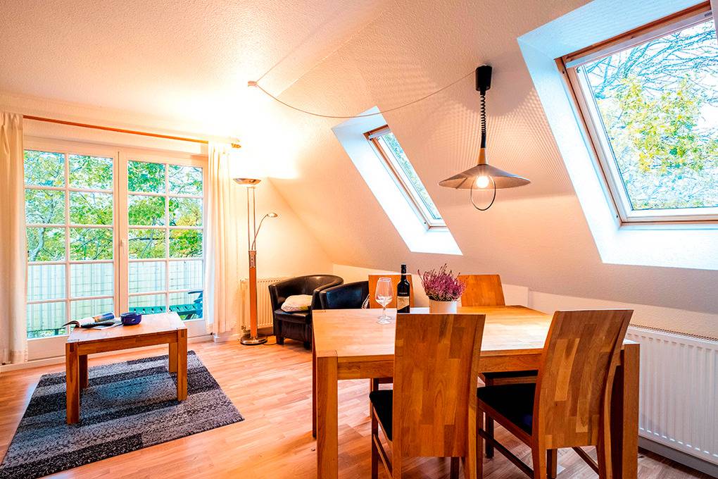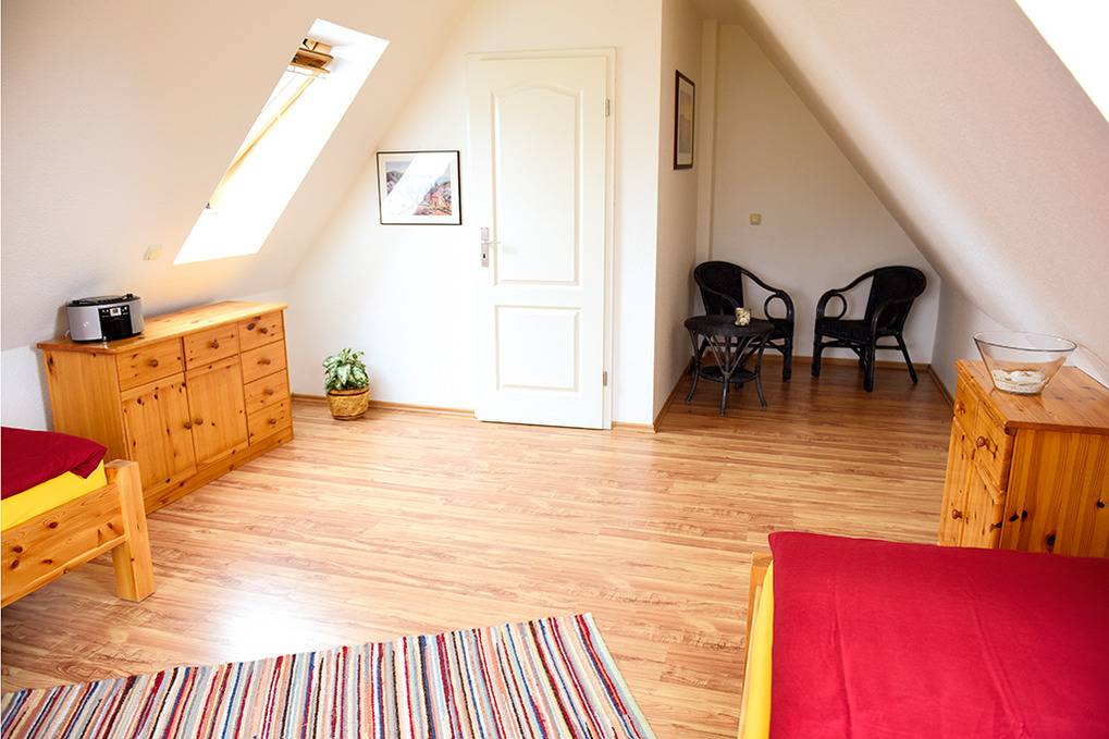 D 67.6118 Wohnung 2-4 Pers.: Großzügige, moderne 3-Zimmerwohnung mit 80 qm Wohnfläche über 2 Etagen, 1. Etage. Wohn-/Essraum mit Couchgarnitur, Sat-TV, DVD, Esstisch, Küchenzeile (Mikrowelle, Spülmaschine). Doppelzimmer. Bad/WC. Flur mit Waschmaschine, Wendeltreppe ins ausgebaute Dachgeschoss (abgeschlossen zum Flur): 2-Bettzimmer mit gemütlicher Sitzecke, Radio/CD. Großer Balkon mit Sitzmöbeln.