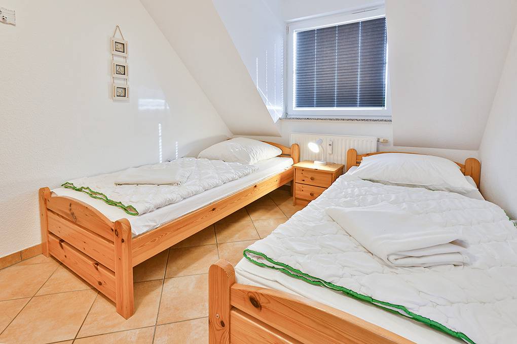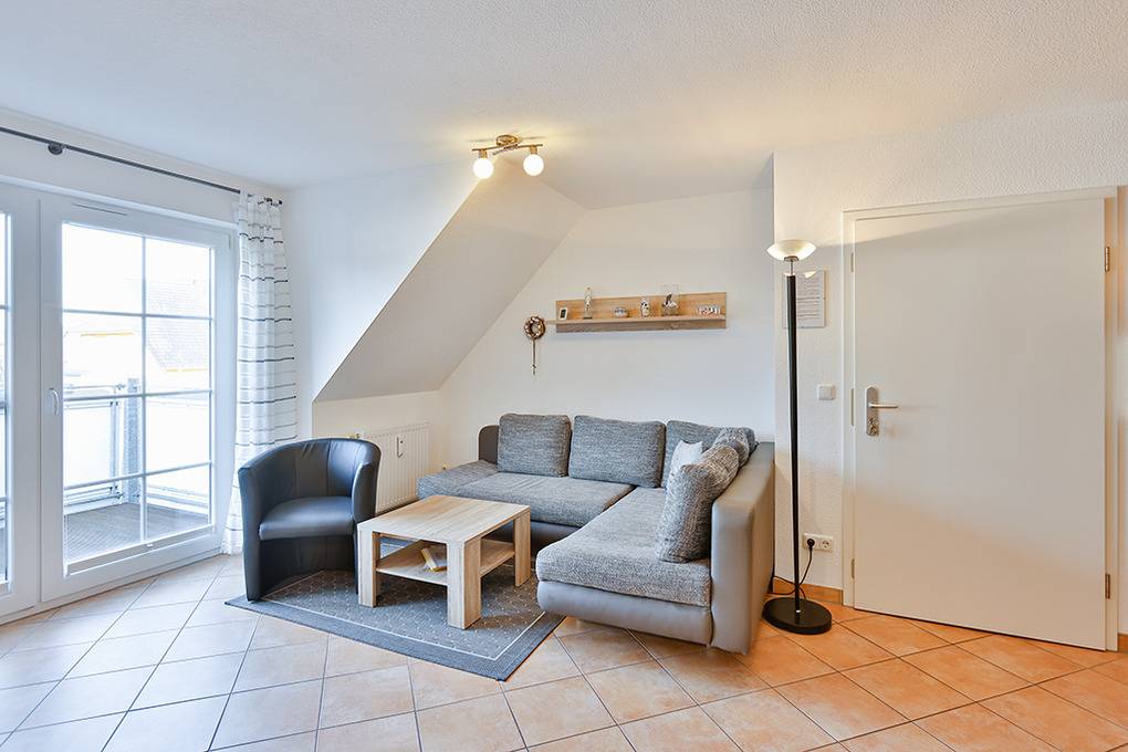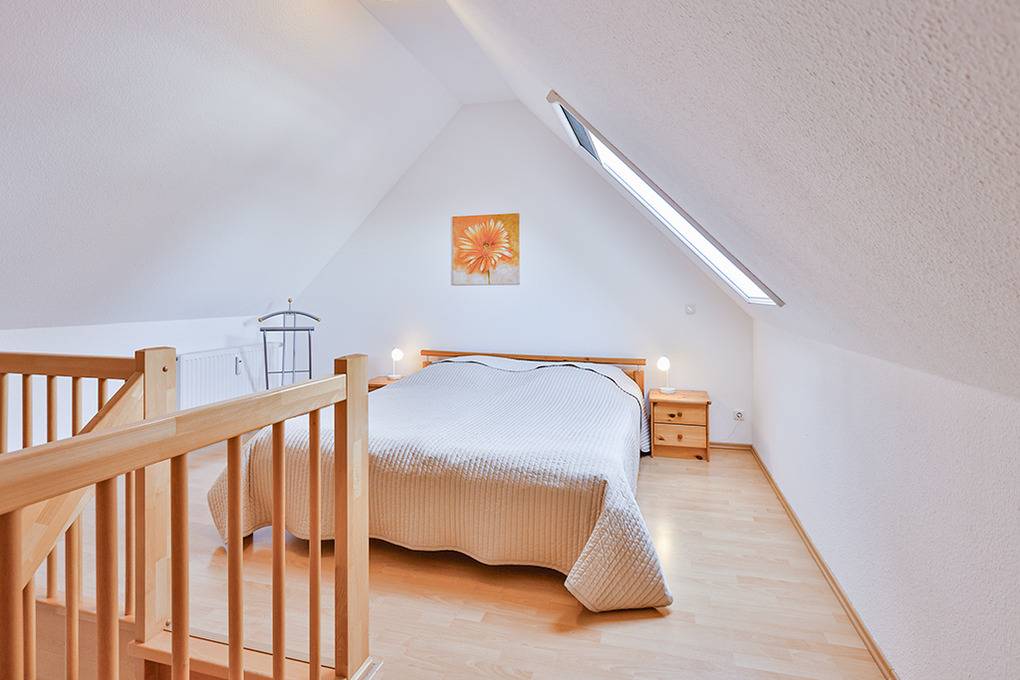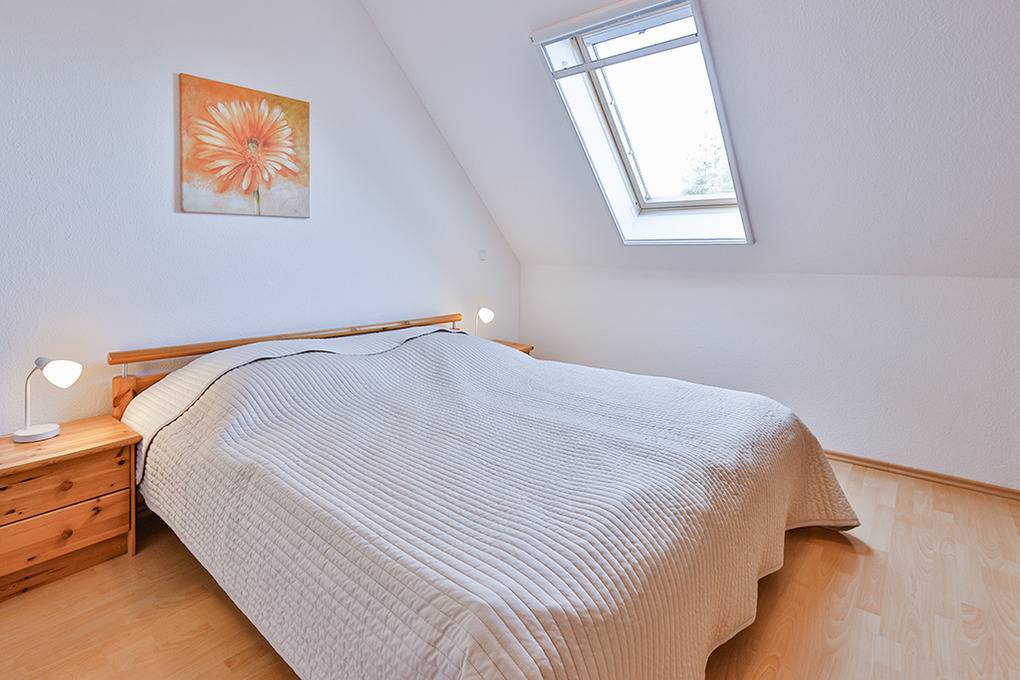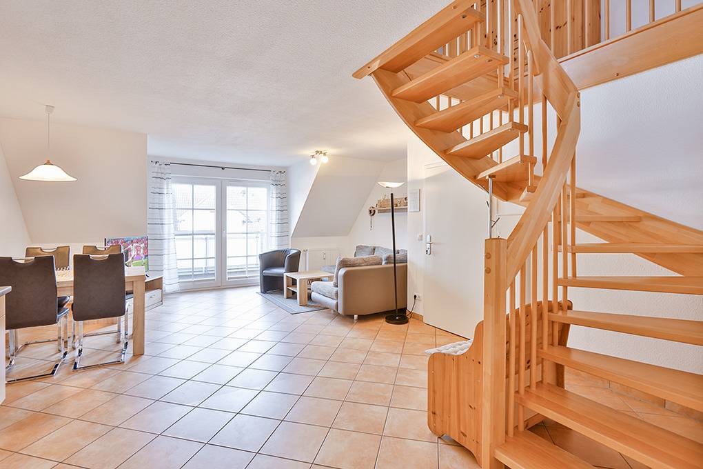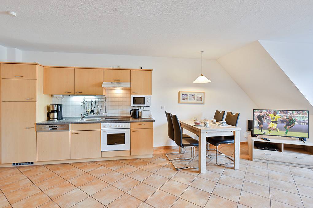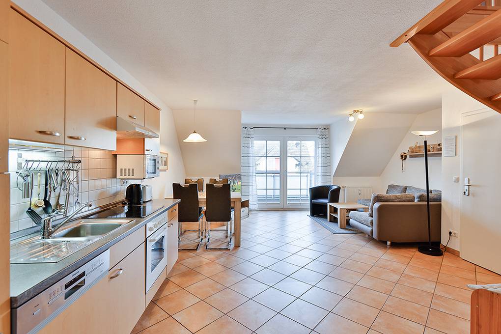 D 067.102 Wohnung 1-4 Pers.: 3-Zimmer-Nichtraucherwohnung mit 57 qm Wohnfläche über 2 Etagen, 1. Etage. Wohn-/Essraum mit Sitzgarnitur, Smart-TV, Blu-Ray-Player, Esstisch, Küchenzeile (Backofen, Mikrowelle, Spülmaschine). 2-Bettzimmer mit 2 Einzelbetten. Bad/WC. Treppe ins ausgebaute Dachgeschoss (offen zum Wohnraum): Doppelzimmer. Balkon mit Sitzmöbeln.