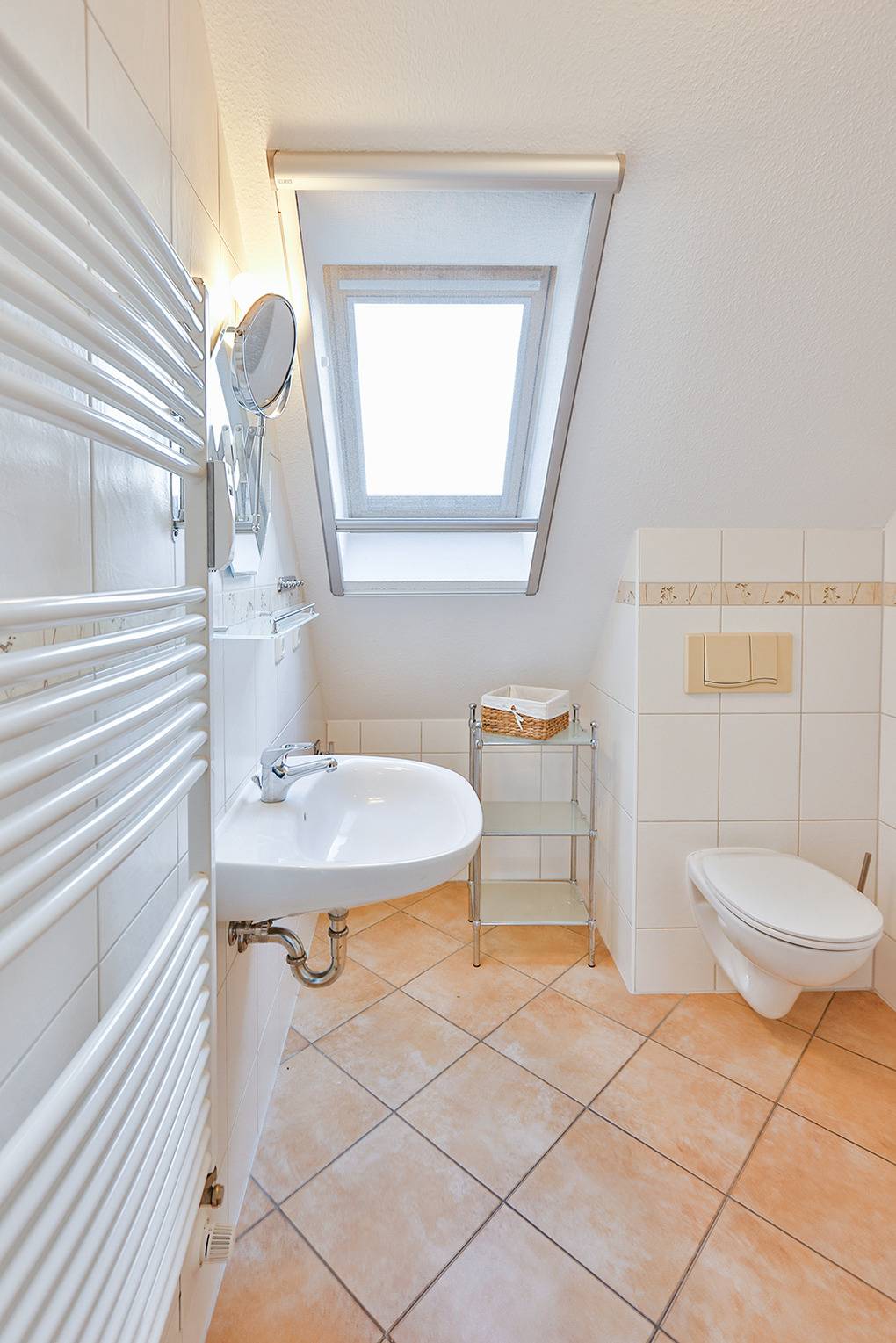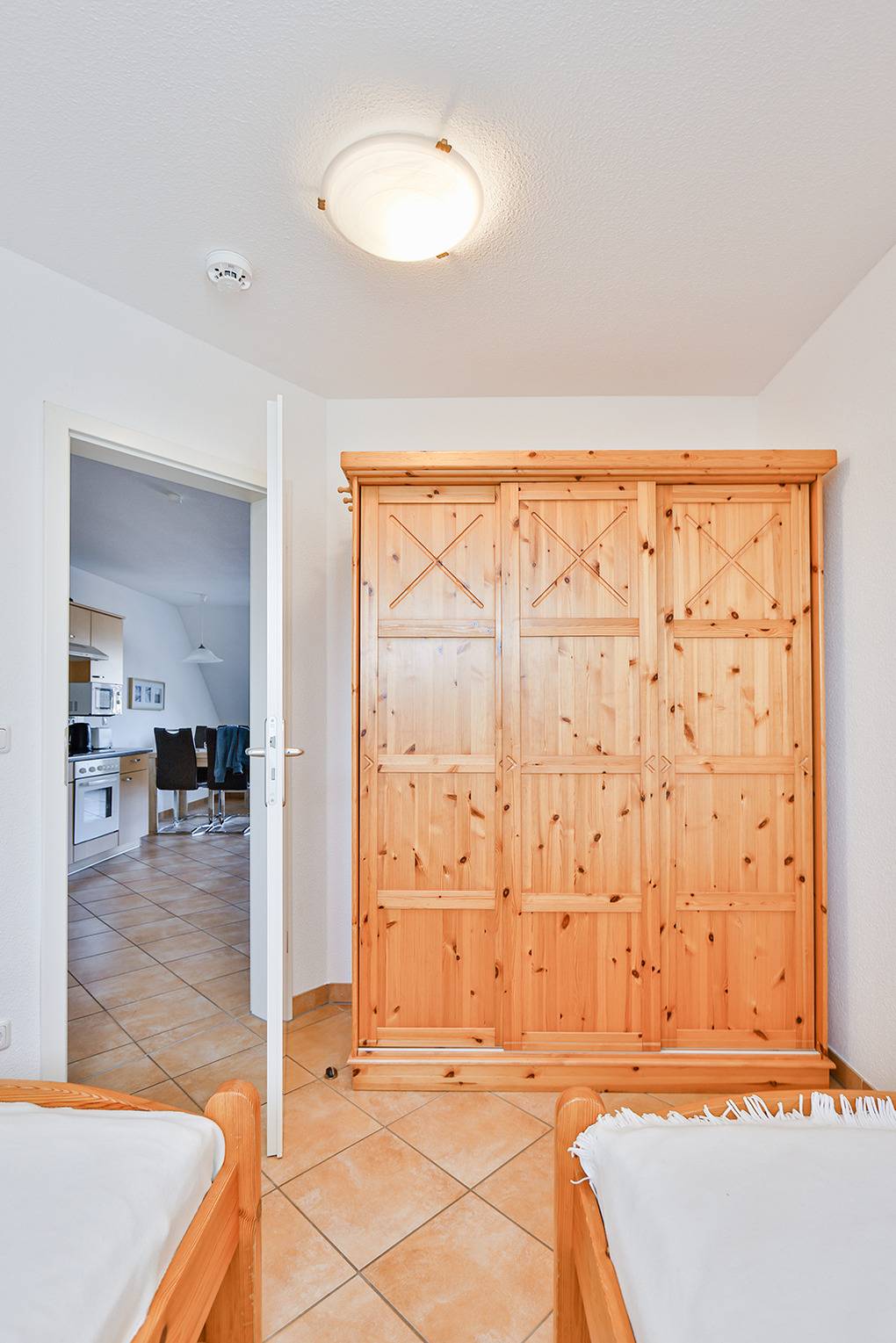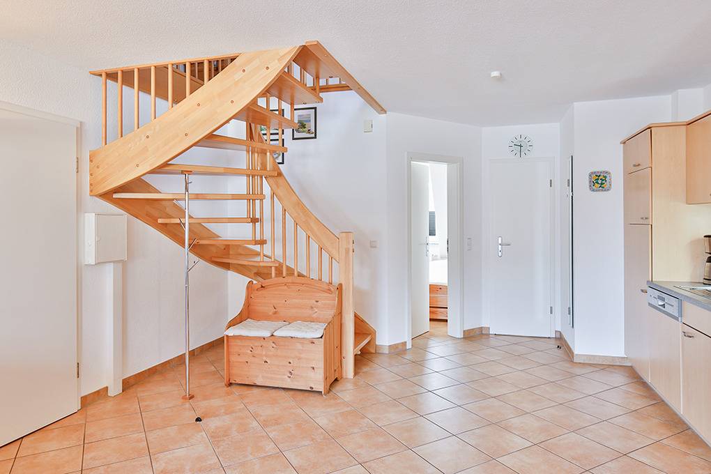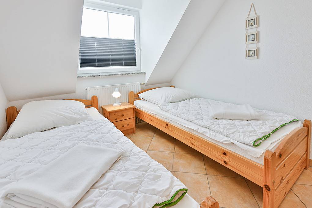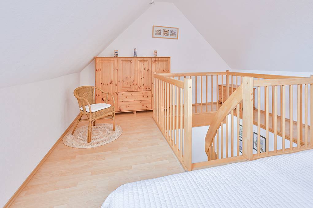 D 067.102 Wohnung 1-4 Pers.: 3-Zimmer-Nichtraucherwohnung mit 57 qm Wohnfläche über 2 Etagen, 1. Etage. Wohn-/Essraum mit Sitzgarnitur, Smart-TV, Blu-Ray-Player, Esstisch, Küchenzeile (Backofen, Mikrowelle, Spülmaschine). 2-Bettzimmer mit 2 Einzelbetten. Bad/WC. Treppe ins ausgebaute Dachgeschoss (offen zum Wohnraum): Doppelzimmer. Balkon mit Sitzmöbeln.