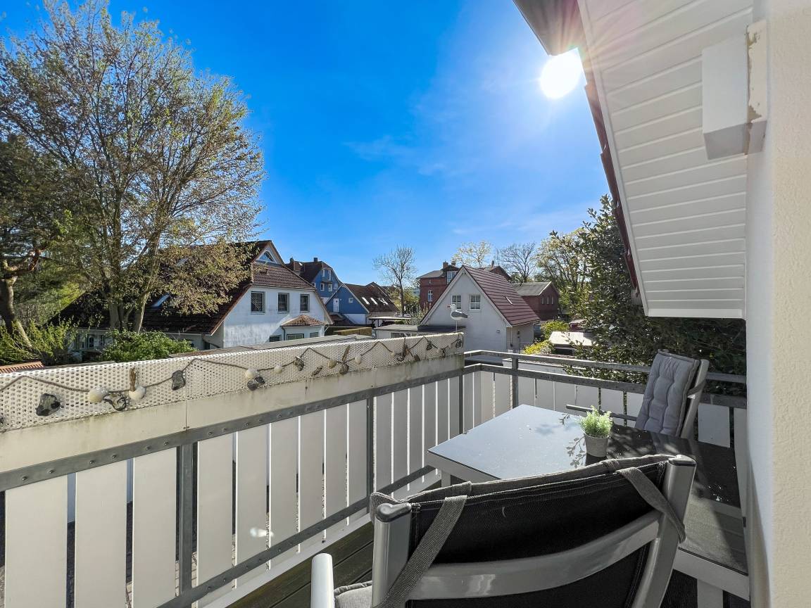 Genießen Sie die frische Seeluft auf dem Balkon, ausgestattet mit Gartenmöbeln, und verbringen Sie entspannte Momente im Freien. Ein Sonnenschirm und ein Elektrogrill stehen für gemütliche Stunden zur Verfügung.