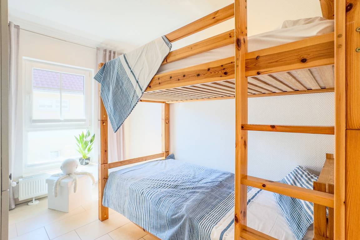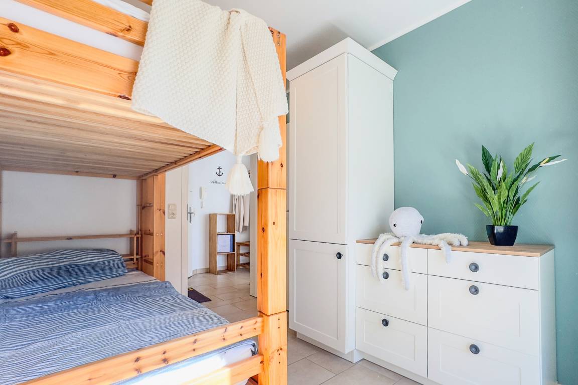 Die Ferienwohnung Seeluft empfängt Sie mit einer modernen und einladenden Atmosphäre. Der Wohnbereich mit voll ausgestatteter Küche bietet alles, was Sie für kulinarische Genüsse benötigen. Das gemütliche Schlafzimmer mit Boxspringbett garantiert erholsame Nächte und verfügt über einen direkten Zugang zum Balkon. Das separate Kinderzimmer mit Etagenbett ist ideal für Familien mit kleinen Gästen.