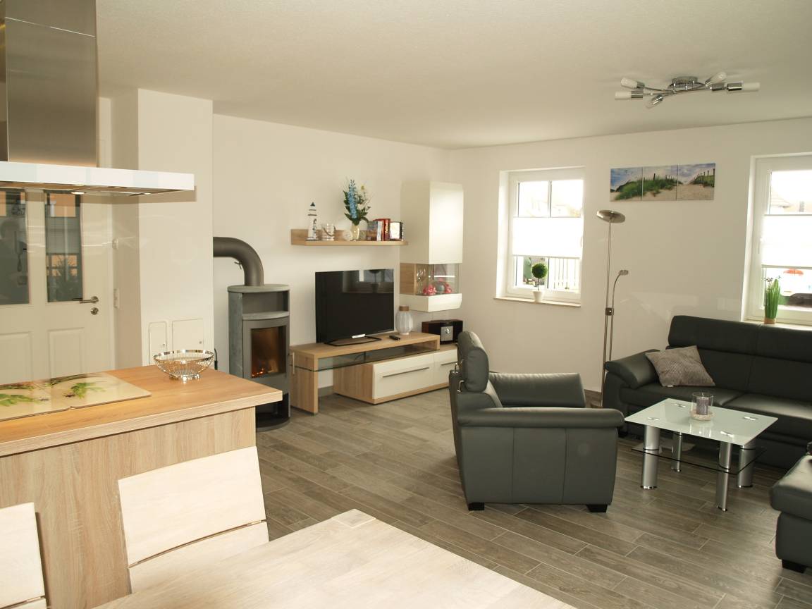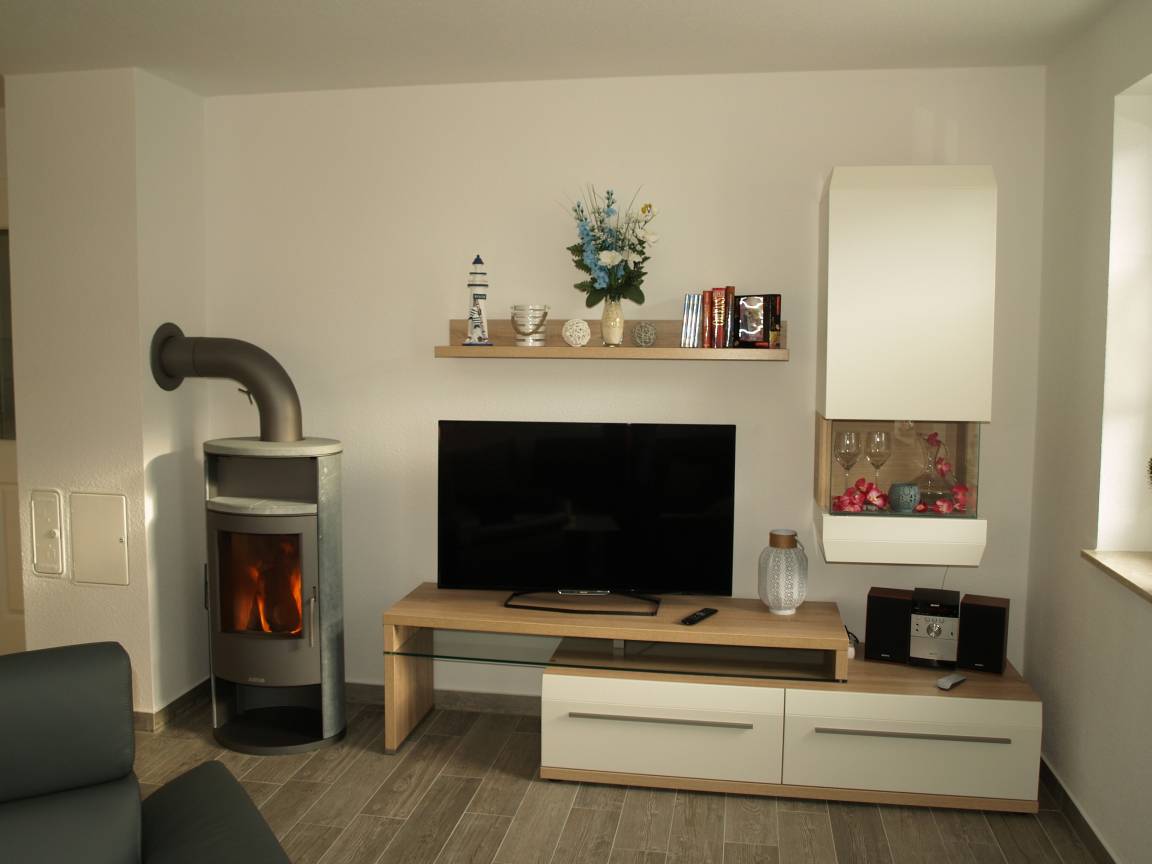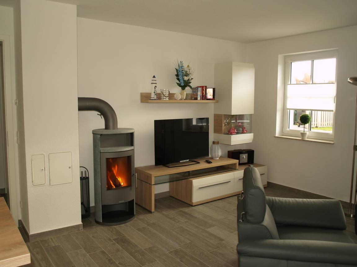 Die behagliche Sofaecke bietet ausreichend Platz und lässt sich leicht in eine zusätzliche Schlafgelegenheit verwandeln. Ein Kaminofen sorgt für angenehme Stunden der Entspannung.