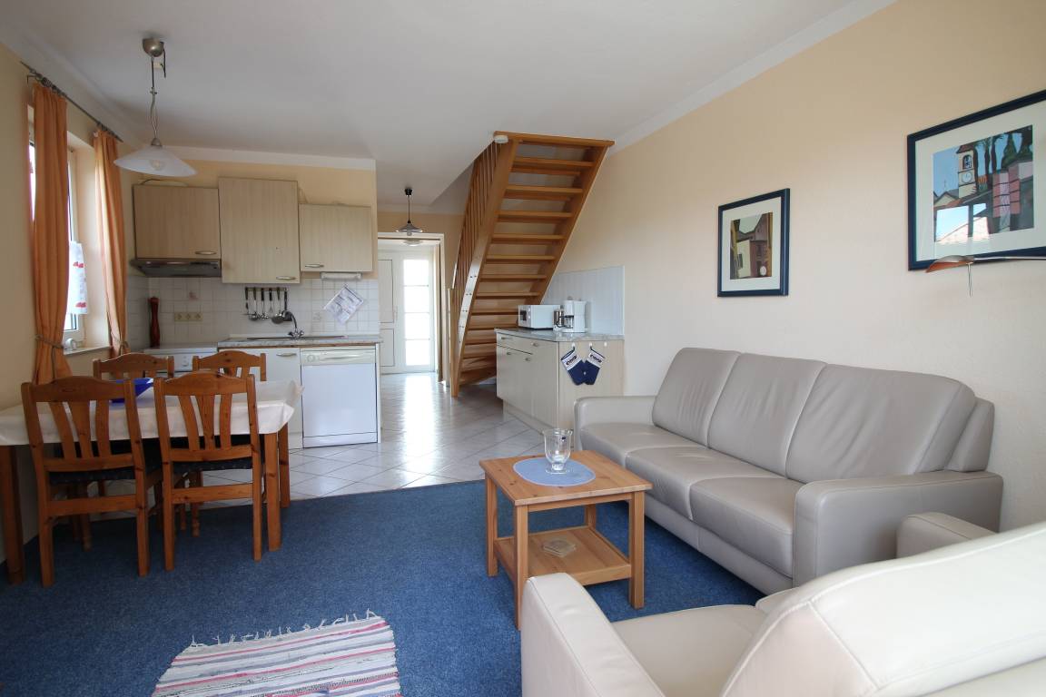 Die 3-Raum-Ferienwohnung bietet auf ca.55qm ausreichend Platz für 4 Personen + Kleinkind.In dem gemütlich eingerichtetem Wohnzimmer stehen Ihnen ein TV zur Verfügung. Von hier haben Sie einen direkten Zugang zur sonnigen Süd-Terrasse mit bequemen Gartenmöbeln, wo Sie einen schönen Strandtag ausklingen lassen können.Auf gleicher Ebene befindet sich die offene Küche.Im EG befindlichem Duschbad mit Tageslicht.Im OG befinden sich zwei Schlafzimmer.A