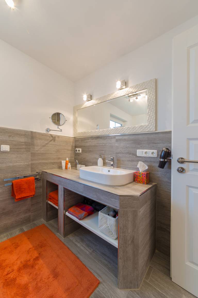 Das Duschbad hat eine breite, ebenerdige Regen-Brause und einen XL-Waschtisch mit viel Stauraum. Waschmaschine und Trockner sind gegen Entgelt im zentralen Servicebereich nutzbar.