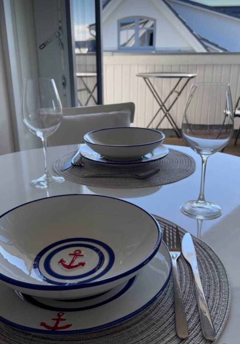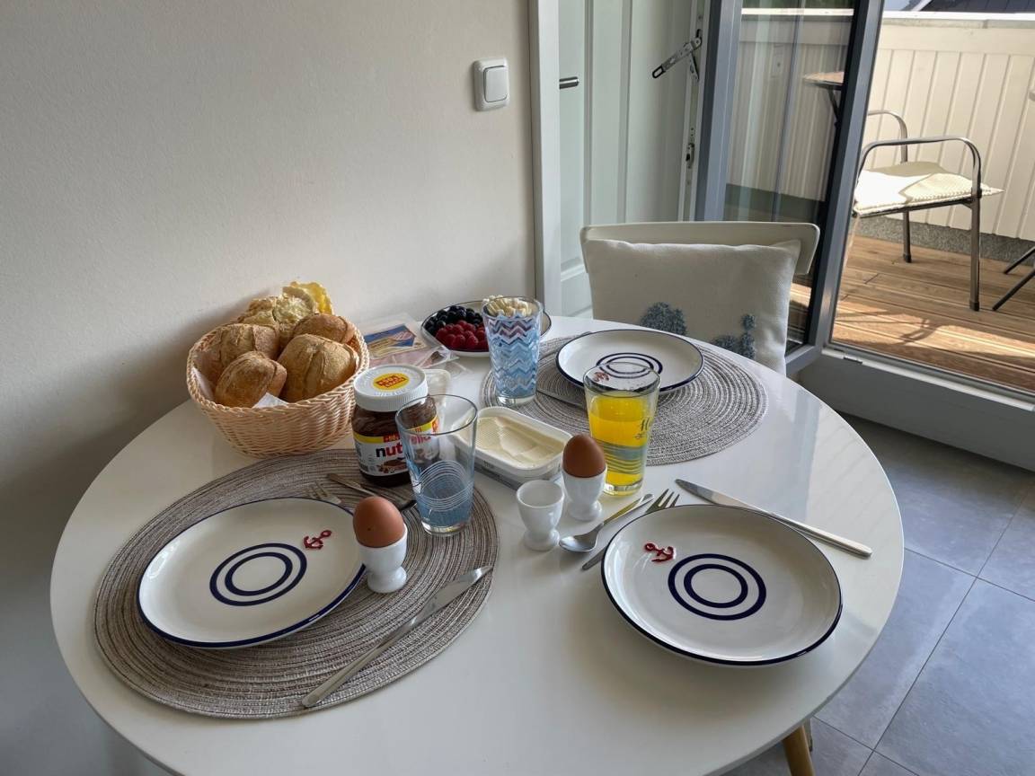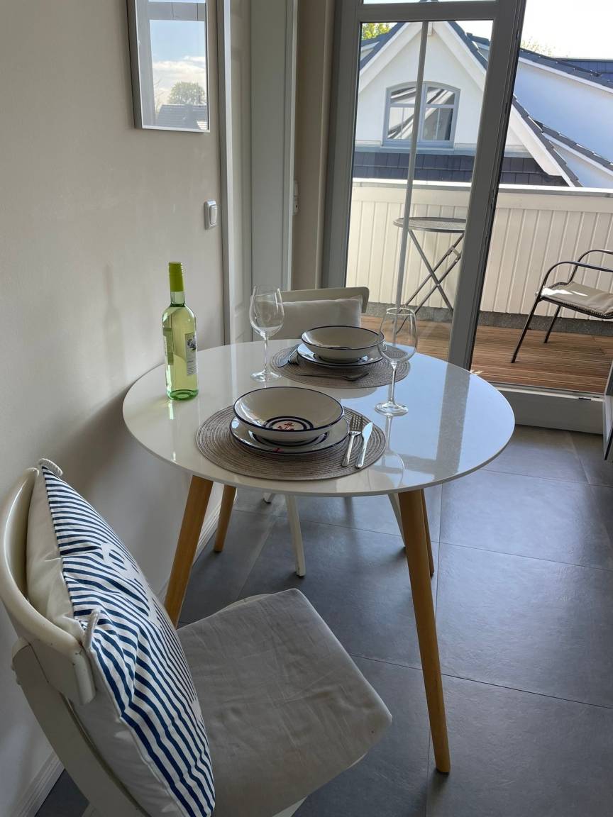 Küchenbereich, ein Schlafzimmer mit Boxspringbett und ein Badezimmer mit elektrischem Dachfenster und Fußbodenheizung. Der überdachte Balkon nach Osten ist mit Stühlen und einem Essplatz ausgestattet. Für Ihren PKW gibt es direkt auf dem Grundstück einen nummerierten Stellplatz.