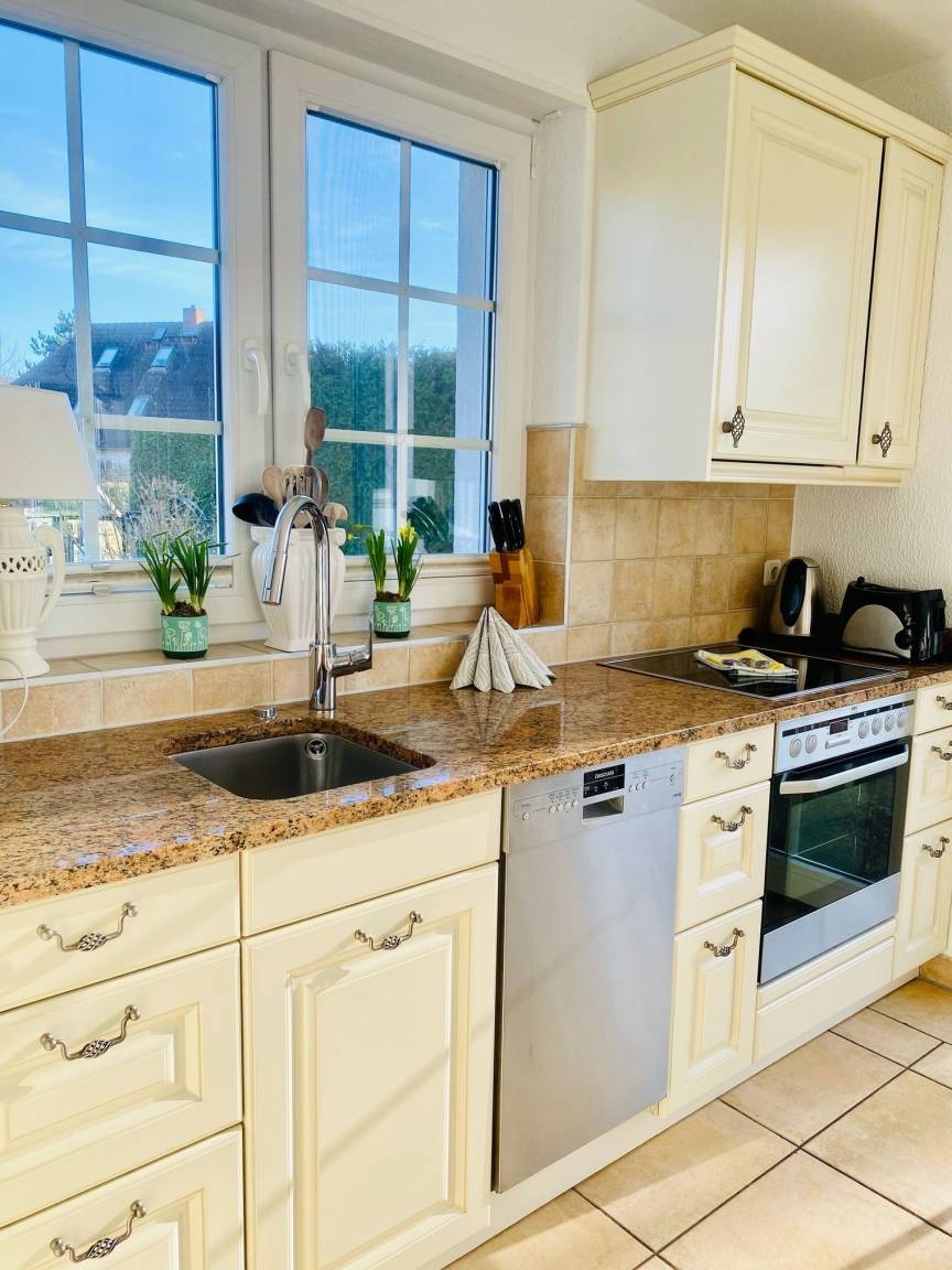 Genießen Sie entspannte Stunden in der lichtdurchfluteten Wohnstube mit Kamin, der an kühleren Abenden eine wohltuende Wärme verbreitet. Die offene Küche ist komplett ausgestattet, sodass Sie nach Herzenslust kochen können.