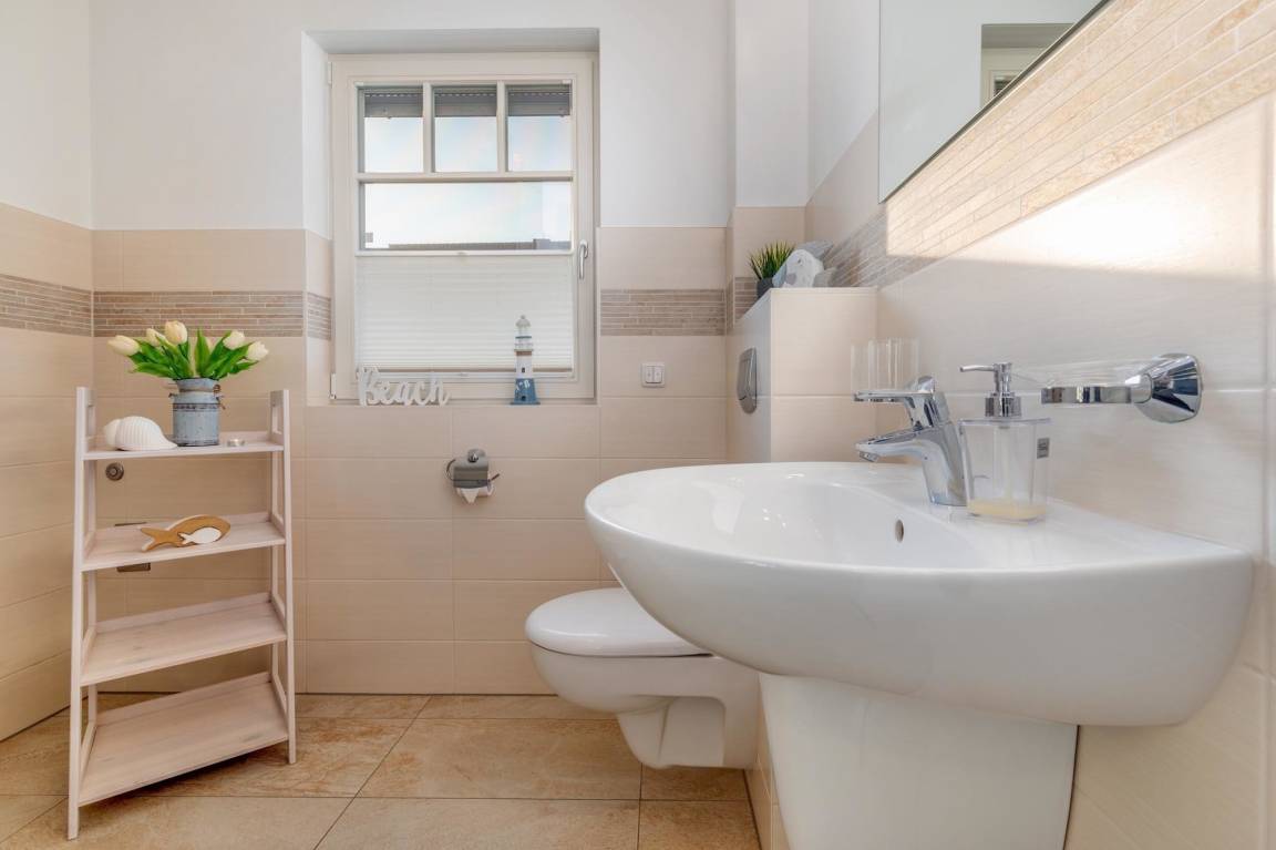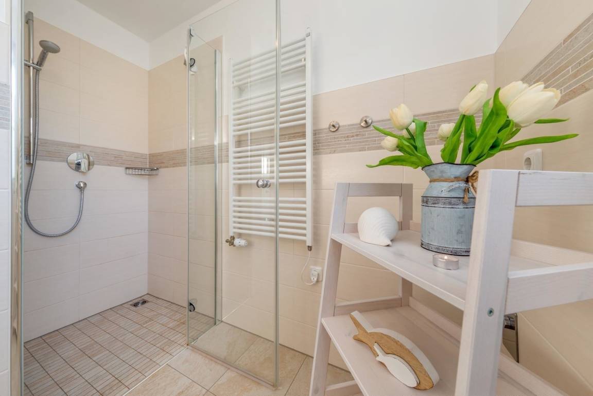 Die Ferienwohnung bietet einen modernen Rückzugsort mit durchdachter Ausstattung für einen erholsamen Aufenthalt. Zwei Schlafzimmer, eines mit einem Doppelbett und eines mit zwei Einzelbetten, gewährleisten ausreichend Platz für Familien oder Gruppen. Das Badezimmer verfügt über eine bodengleiche Dusche und ist mit einem Haartrockner sowie hochwertigen Annehmlichkeiten ausgestattet.