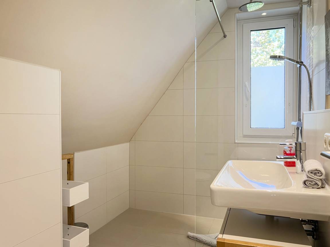 Badezimmer 1: Ebenerdige Dusche/WC mit Fußbodenheizung und Haartrockner