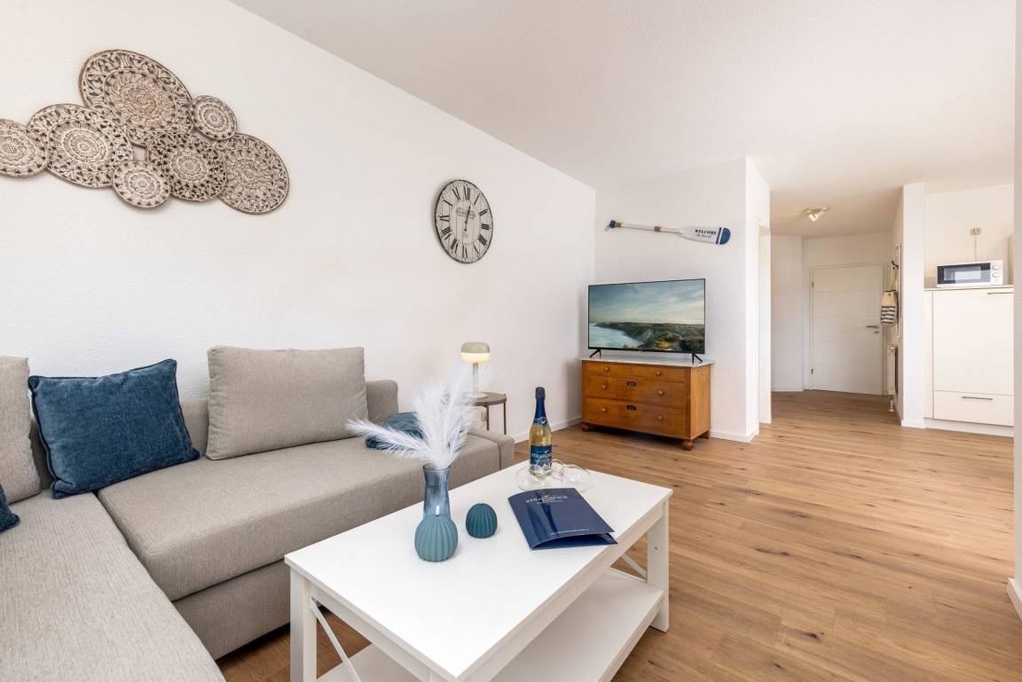 Das „Segeltörn" ist eine moderne Ferienwohnung im Herzen von Zingst und eignet sich ideal für bis zu drei Personen. Auf 51 m² erwarten die Gäste ein Schlafzimmer mit einem Doppelbett (180x200 cm), ein Schlafsofa (140x200 cm) im offenen Wohn- und Essbereich sowie ein Badezimmer mit Dusche und Wanne. Die vollausgestattete Küchenzeile bietet Herd, Kühlschrank, Geschirrspüler und Mikrowelle für entspannte Kochmomente. Unterhaltung wird durch zwei Flachbild-Fernseher und kostenfreies WLAN gewährleistet. Ein Balkon lädt dazu ein, die frische Ostseeluft zu genießen. Weitere Annehmlichkeiten wie eine Waschmaschine und ausreichend Stauraum machen den Aufenthalt komfortabel. Haustiere sind auf Anfrage gestattet und ein Parkplatz steht direkt vor der Unterkunft zur Verfügung. Die Nichtraucherwohnung liegt nur 1000 Meter vom Strand entfernt, umgeben von Einkaufsmöglichkeiten.