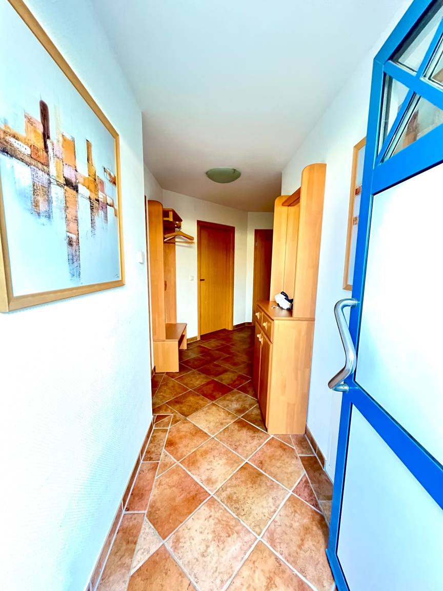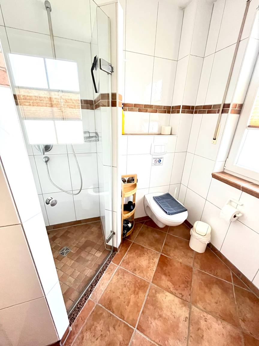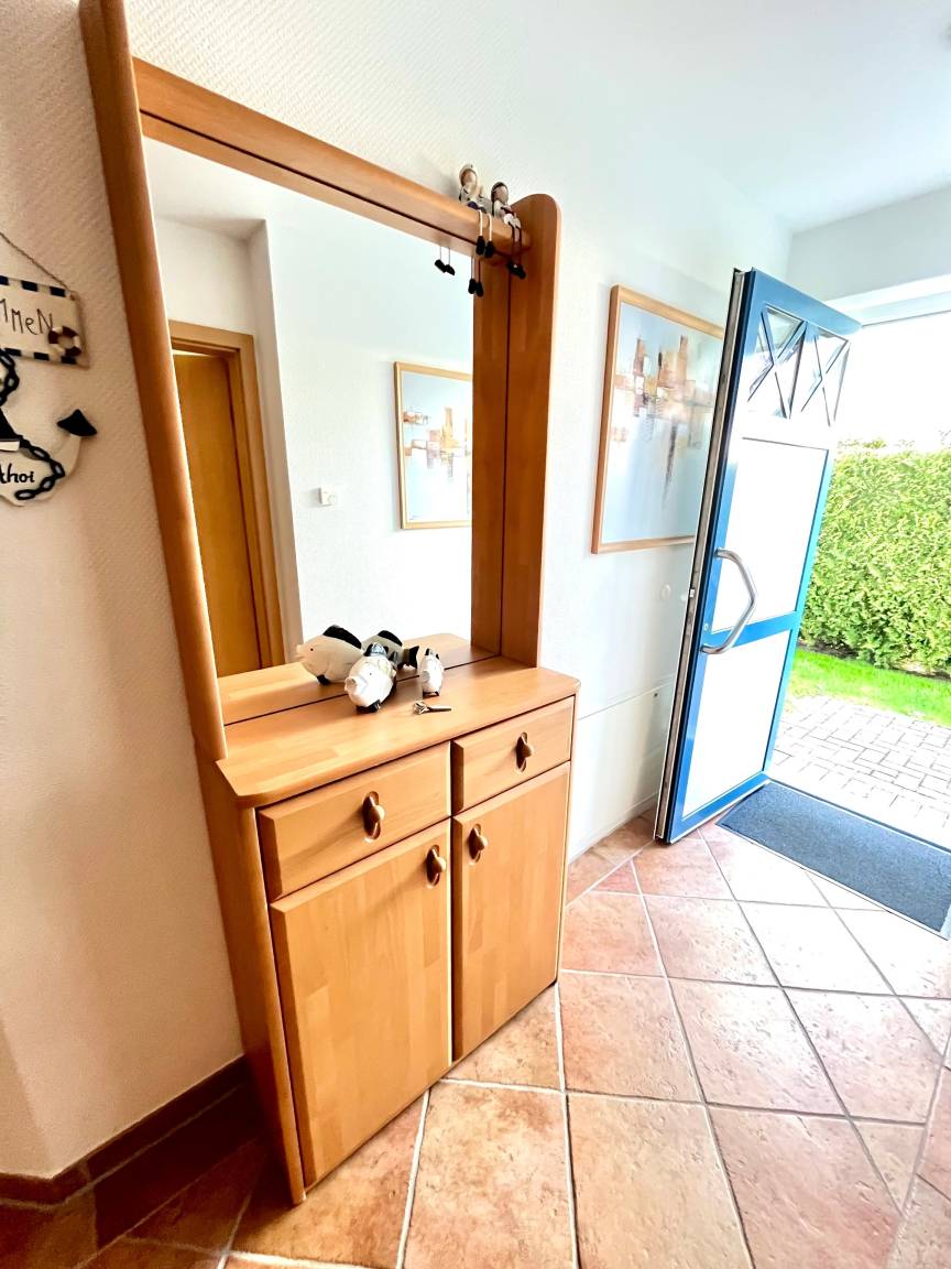 Die gemütliche und vollausgestattete 3-Zimmer-Wohnung bietet im Erdgeschoss mit der überdachten Terrasse und dem kleinen Garten die beste Voraussetzung, um sich zu erholen. Im 'Eltern'-Schlafzimmern finden Sie ein großes Doppelbett, im 'Kinder'-Zimmer zwei große Einzelbetten. Das zusätzliche Babybett bereiten wir Ihnen vor, wenn Sie uns bei Buchung einen Hinweis geben. Das Wohnzimmer mit der offenen Küche lässt Spielraum für die ganze Familie. Wenn die Jahreszeit kuschlige Momente sehnsüchtig einfordert, schenkt Ihnen der Kaminofen reinste Behaglichkeit. Neben einem Flachbildschirm, Radio und Internet (WLAN) stehen auch Spiele zur Verfügung. In der Küche finden Sie Geschirrspüler, Kühlschrank mit Gefrierteil, Herd und Cerankochfeld, Kaffeemaschine, Toaster, Wasserkocher und vieles mehr. Für die ganz kleinen Gäste steht ein Kinderstuhl zur Verfügung.