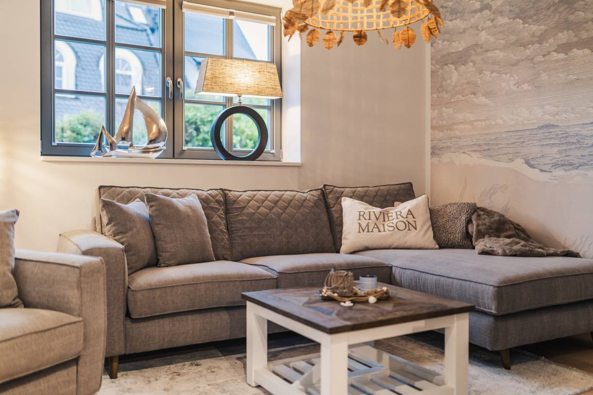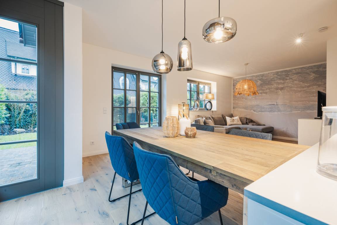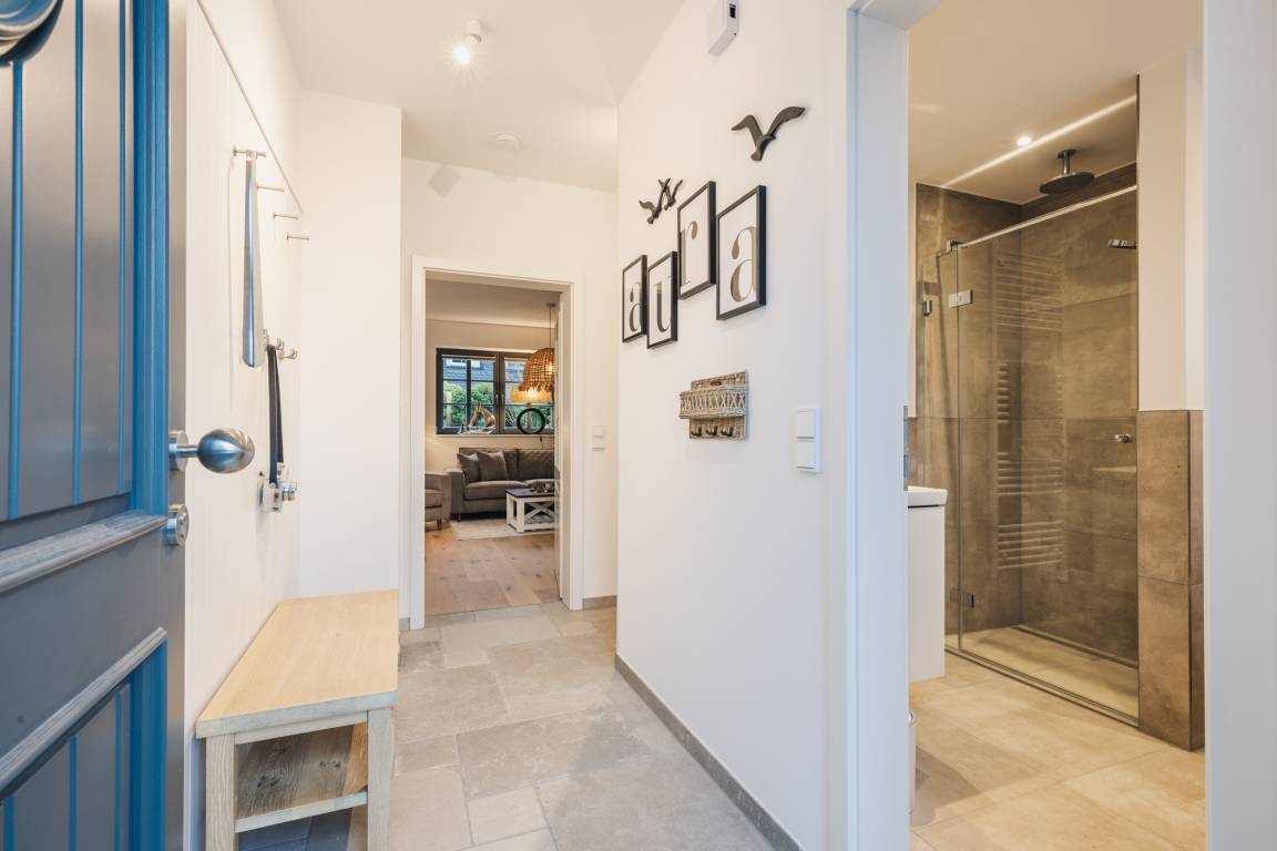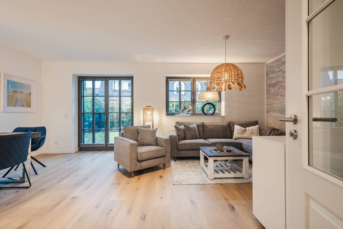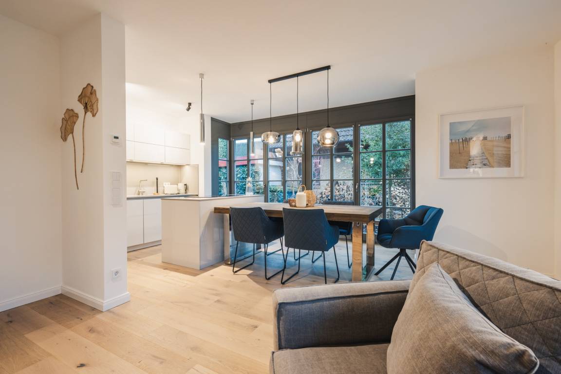 Das Ferienhaus ist gemütlich und komfortabel eingerichtet, um Ihren Aufenthalt so angenehm wie möglich zu gestalten. Der offene Wohnbereich verfügt über eine einladende Sofalandschaft, einen Esstisch und große Fenster, die viel Tageslicht hereinlassen. Die moderne Küche mit Kochinsel ist ausgestattet mit hochwertigen Markengeräten – darunter Geschirrspüler, Backofen und Kapsel-Kaffeemaschine.
