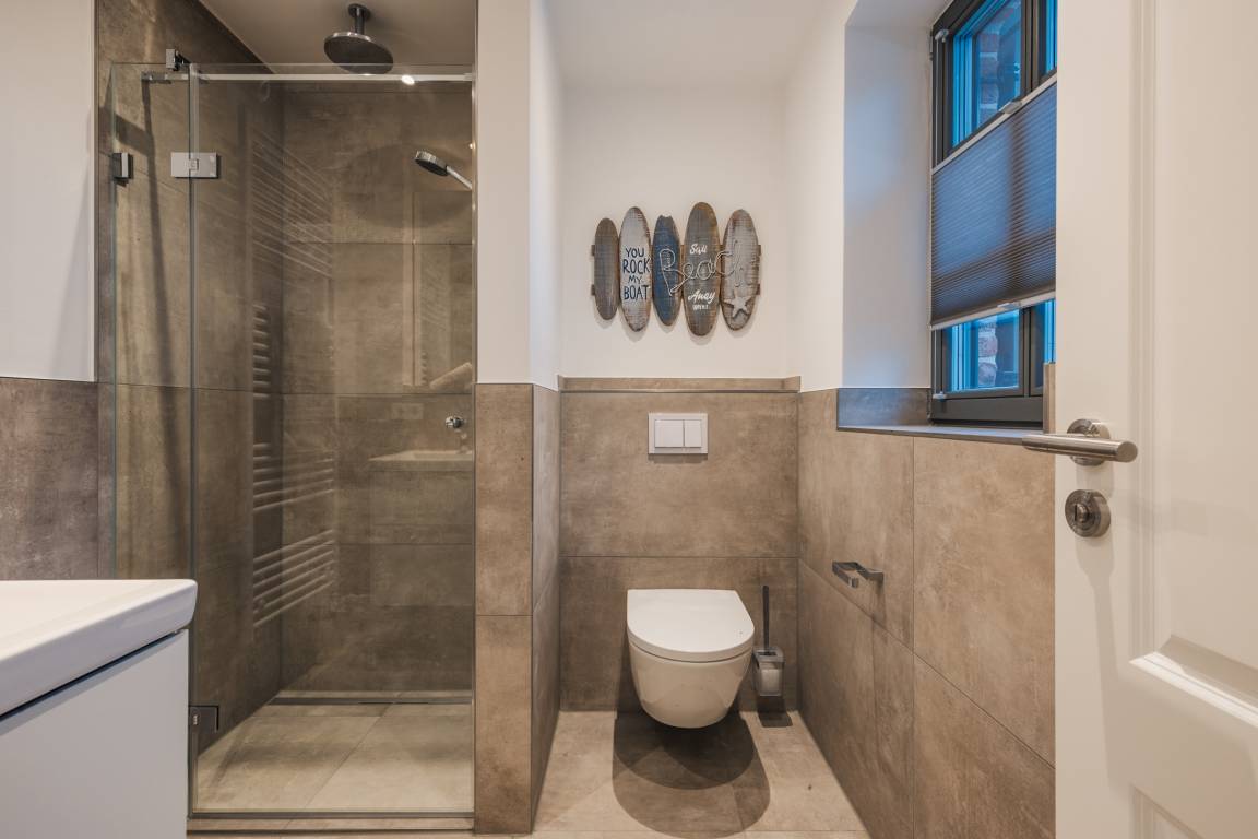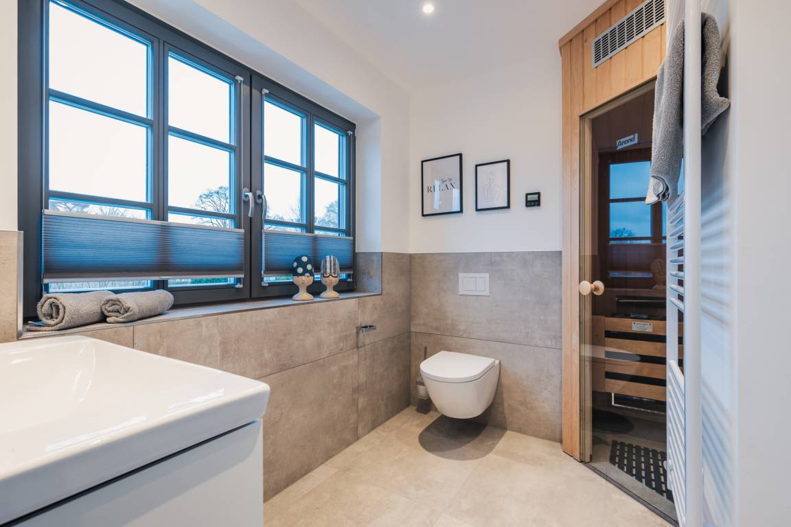 Das Ferienhaus verfügt über zwei moderne Badezimmer, beide mit geräumigen Duschen und hochwertigen Armaturen. Das Hauptbadezimmer bietet zusätzlich eine entspannende Sauna, in der Sie die Wärme genießen und neue Energie tanken können.