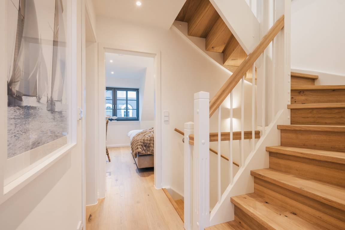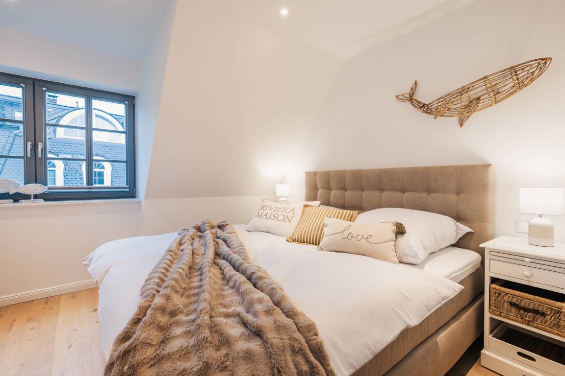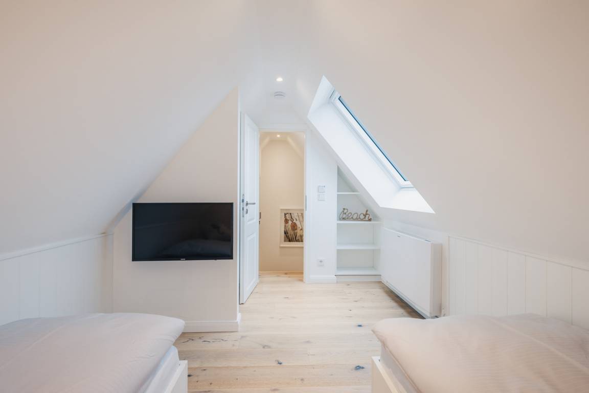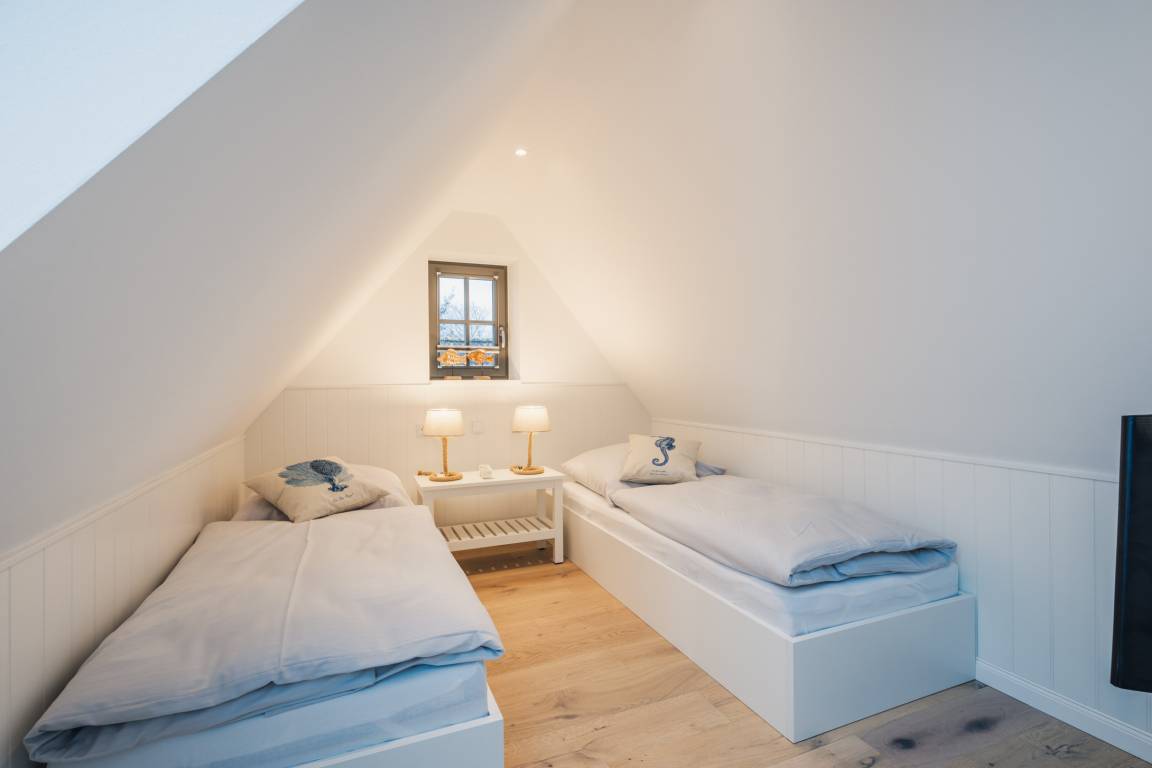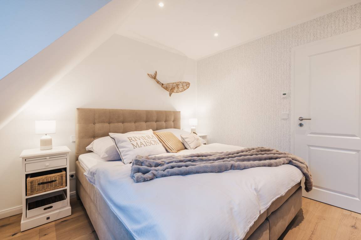 Die drei Schlafzimmer sind mit zwei bequemen Boxspringbetten und zwei Einzelbetten eingerichtet. Verdunkelnde Plissees sorgen für erholsame Nächte, und alle Schlafzimmer bieten ausreichend Stauraum für Ihr Gepäck.Hinweis: Die Betten sind bei Ihrer Anreise stets frisch bezogen. Bitte beachten Sie, dass grundsätzlich immer nur so viele Betten bezogen werden, wie Personen anreisen. Da das Haus über zwei Doppelbetten und zwei Einzelbetten verfügt, werden bei einer Buchung von vier Personen standardmäßig die beiden Doppelbetten vorbereitet, gleiches gilt auch bei zwei Personen, da wird nur ein Doppelbett bezogen. Wir gehen davon aus, dass gemeinsam reisende Personen ein Doppelbett teilen. Sollten Sie eine andere Schlafaufteilung wünschen, teilen Sie uns dies bitte vor Ihrer Anreise mit, damit wir die Betten entsprechend vorbereiten können. Eine Einsicht in das persönliche Verhältnis der Reisenden besteht selbstverständlich nicht.