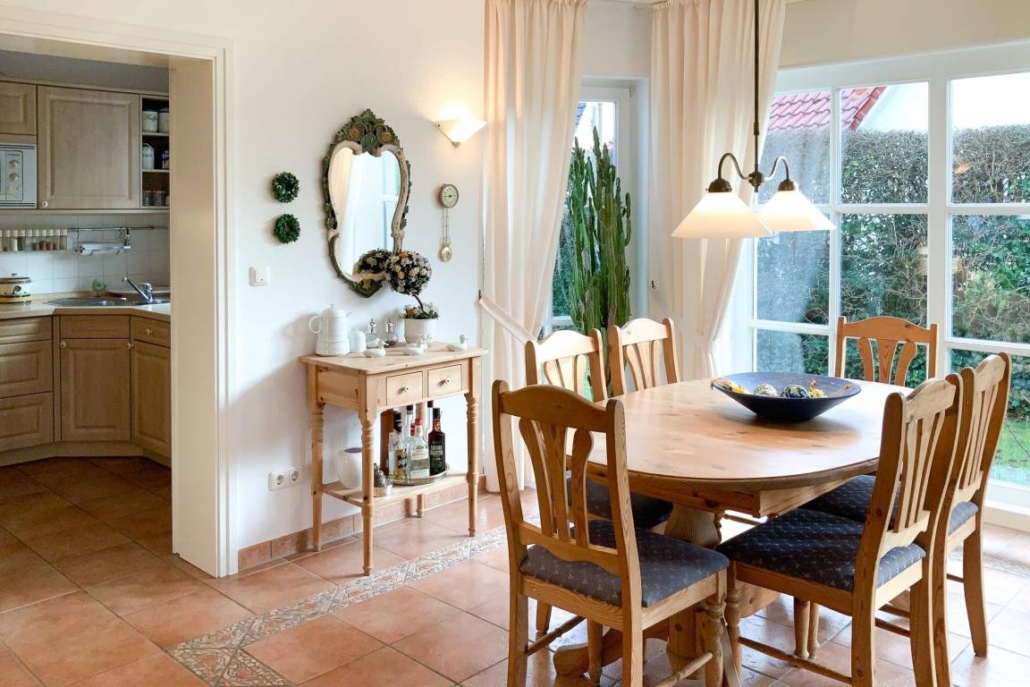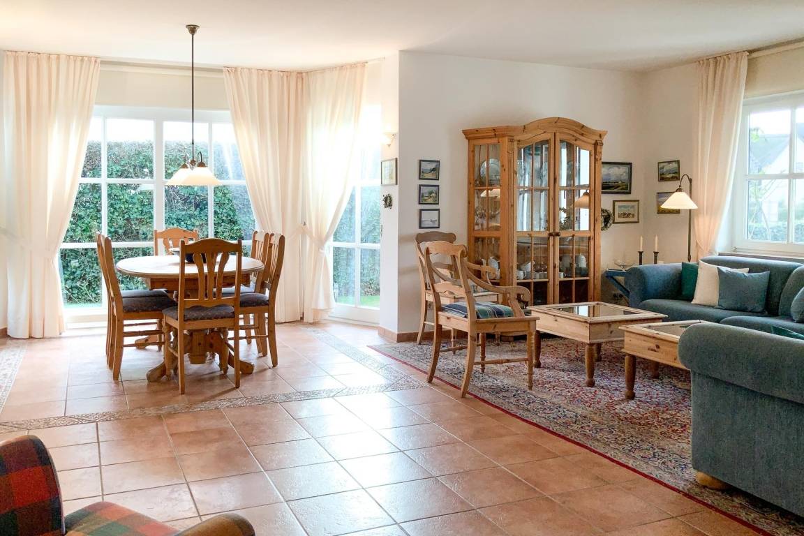 Die Ferienwohnung Windflüchter Nr. 4 empfängt Sie mit einer großzügigen und einladenden Atmosphäre. Der helle Wohn- und Essbereich im Landhausstil lädt zu gemütlichen Stunden ein, während die voll ausgestattete separate Küche keine Wünsche offenlässt. Die beiden separaten Schlafzimmer bieten erholsamen Schlafkomfort, und die eigene Terrasse mit Strandkorb lädt zum Verweilen ein.