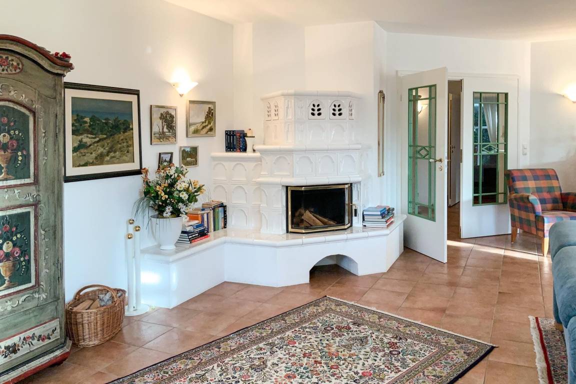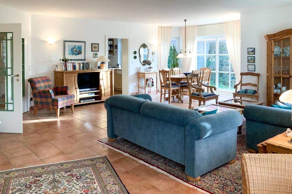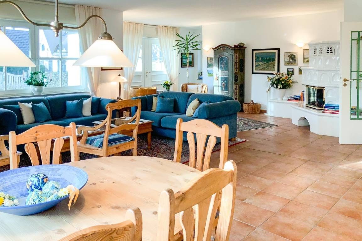 Großzügiger Wohn- und Essbereich im Landhausstil mit Kaminofen für behagliche Abende
