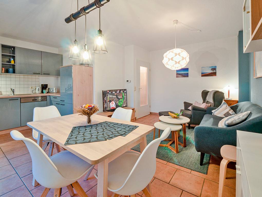 D 67.3133 Wohnung 1-4 Pers.: 3-Zimmerwohnung mit 55 qm Wohnfläche, 1. Etage. Wohn-/Essraum mit Couchgarnitur, Sat-TV, Esstisch, Küchenzeile (Backofen, Spülmaschine). Doppelzimmer. 2-Bettzimmer mit Etagenbett. Bad: Du, Wb, WC, Waschmaschine, Trockner. Balkon mit Sitzmöbeln.
