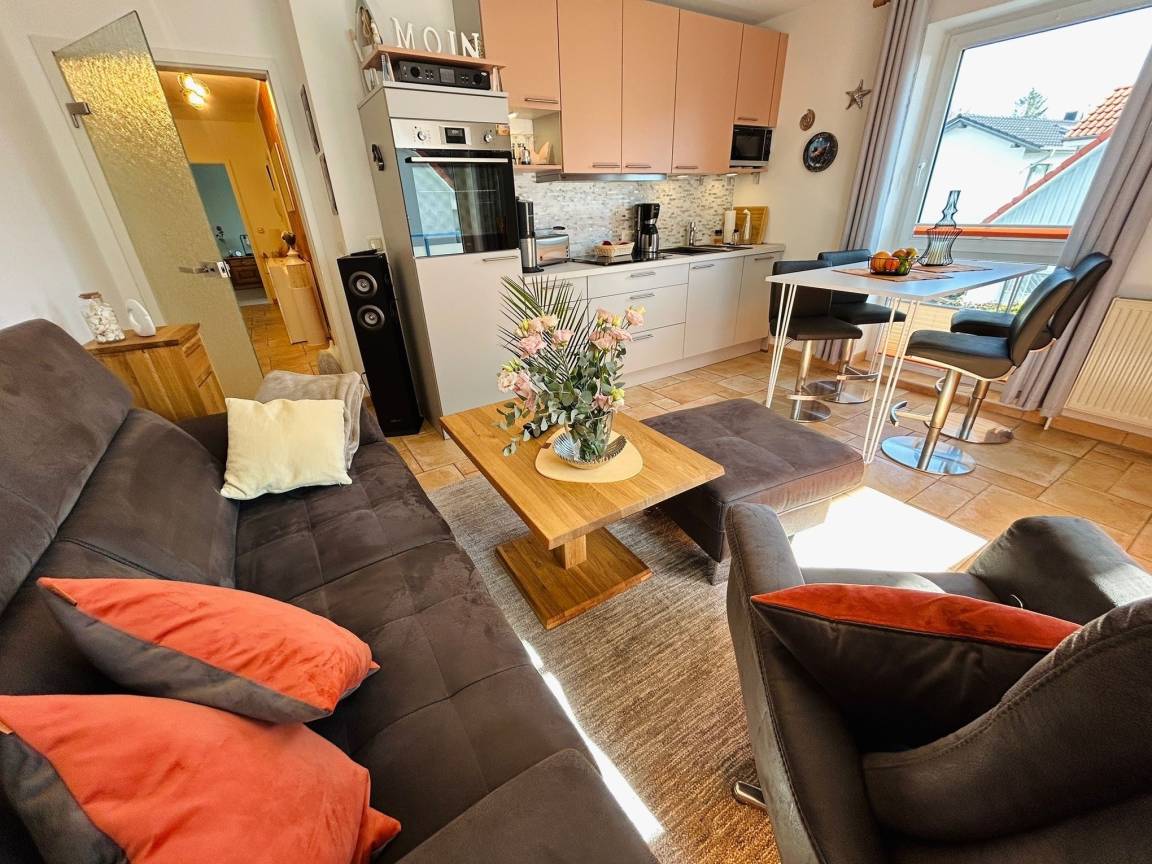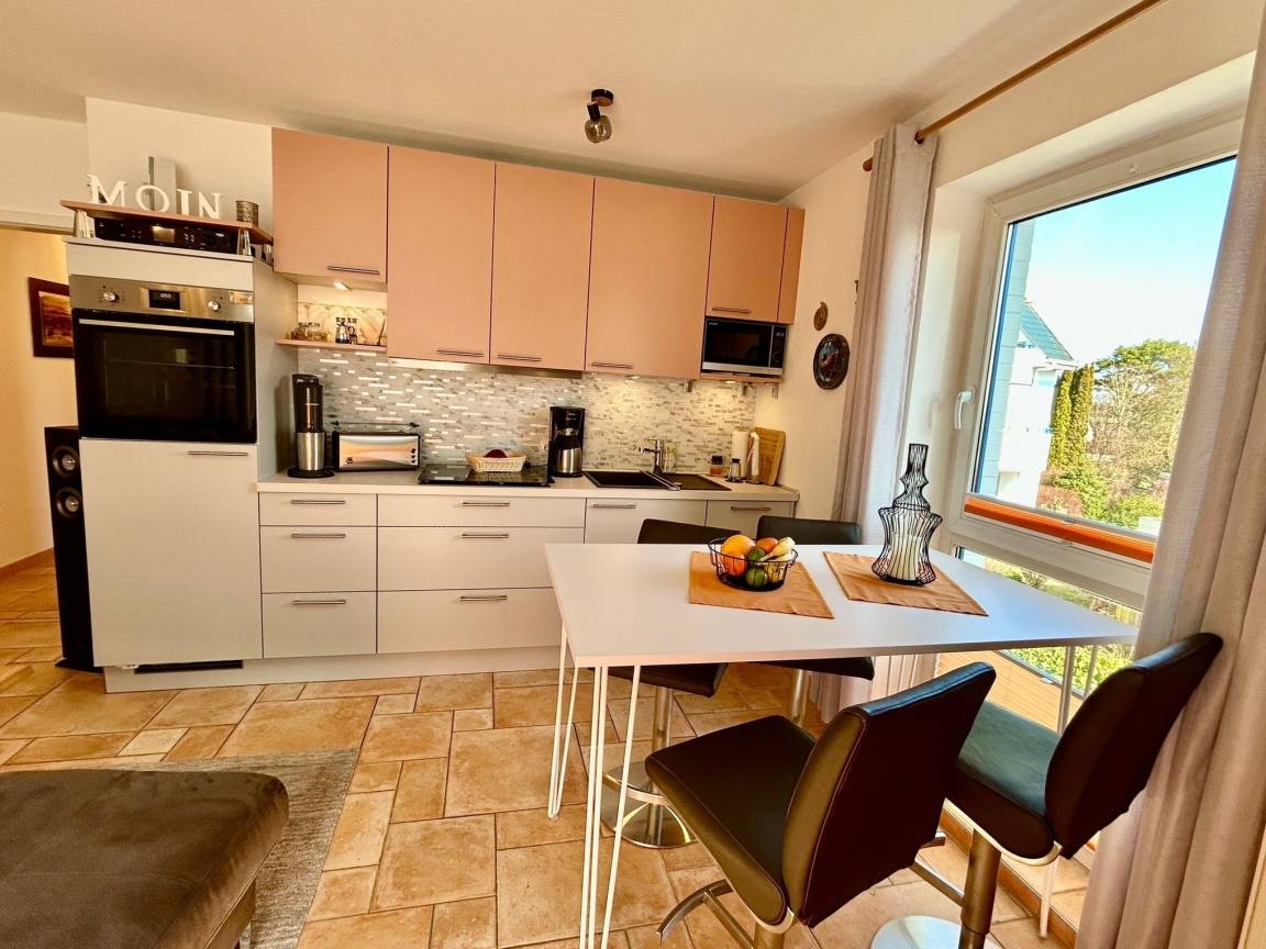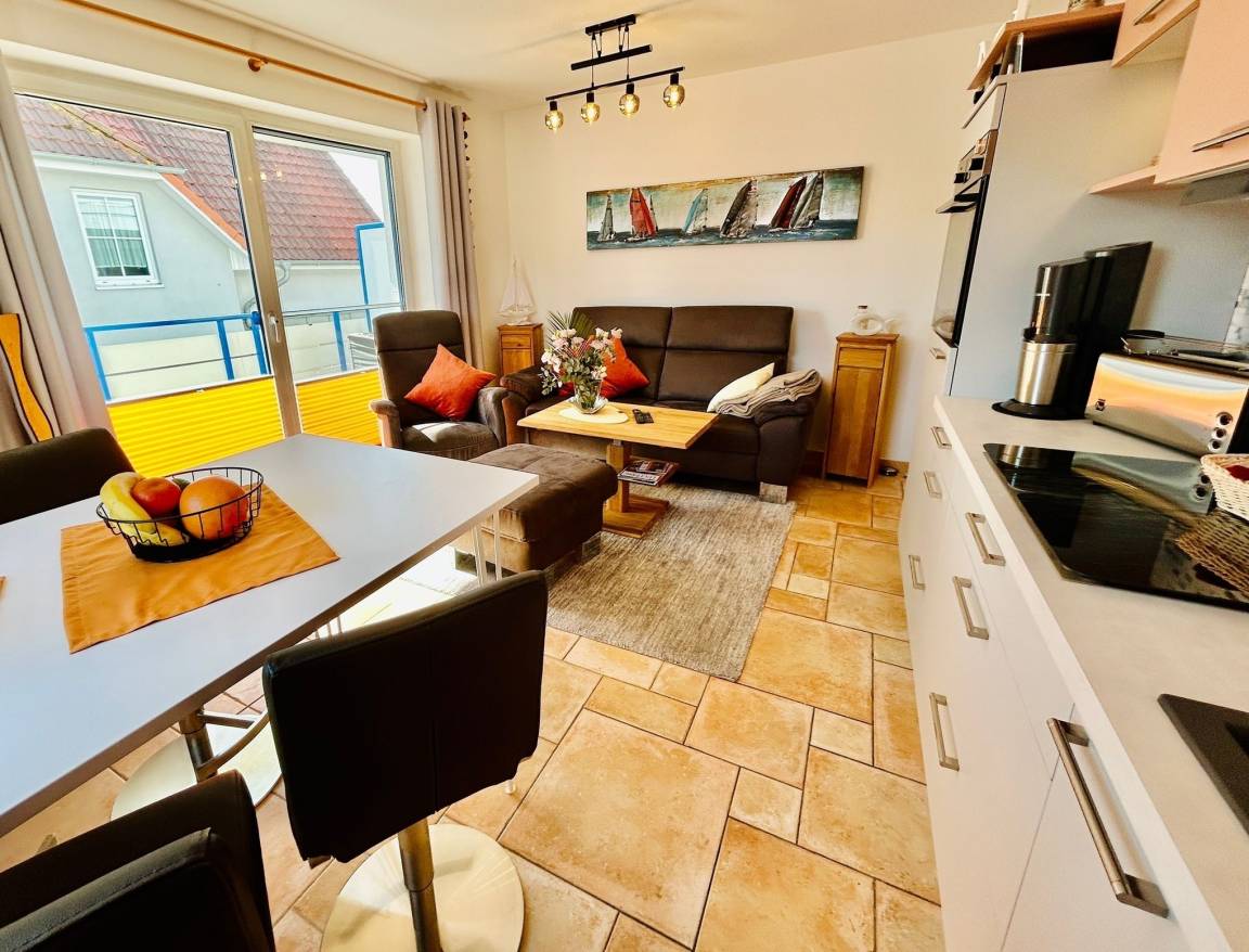 gemütliches Wohnzimmer mit kompletter Küchenzeile, Balkon 1 zur Süd-West-Seite mit Strandkorb, Balkon 2 zur Ostseite mit Gartenblick, Sat-TV (4k), Musikanlage mit Internetradio, unbegrenzter, schneller unlimitierter Gigabit- WLAN Zugang, BluRay Player, Geschirrspüler, Microwelle, Kaffeemaschine, Toaster, Esstisch mit 4 Barhockern (höhenverstellbar),