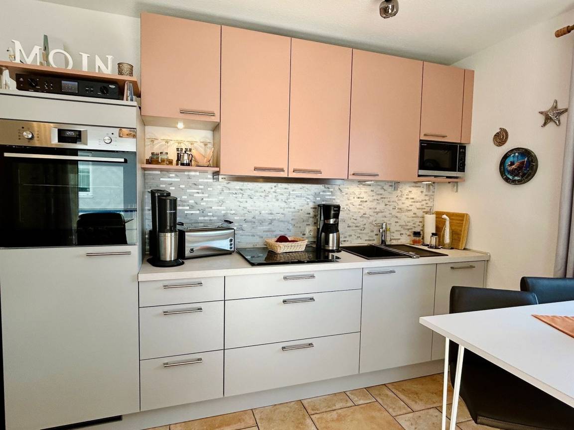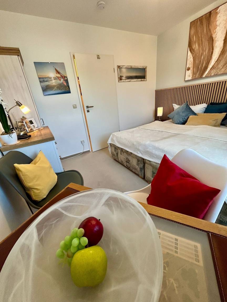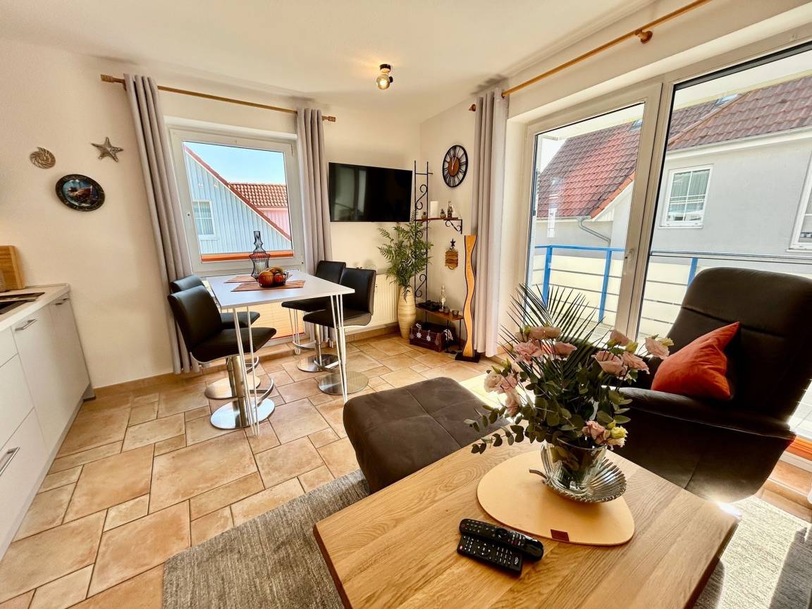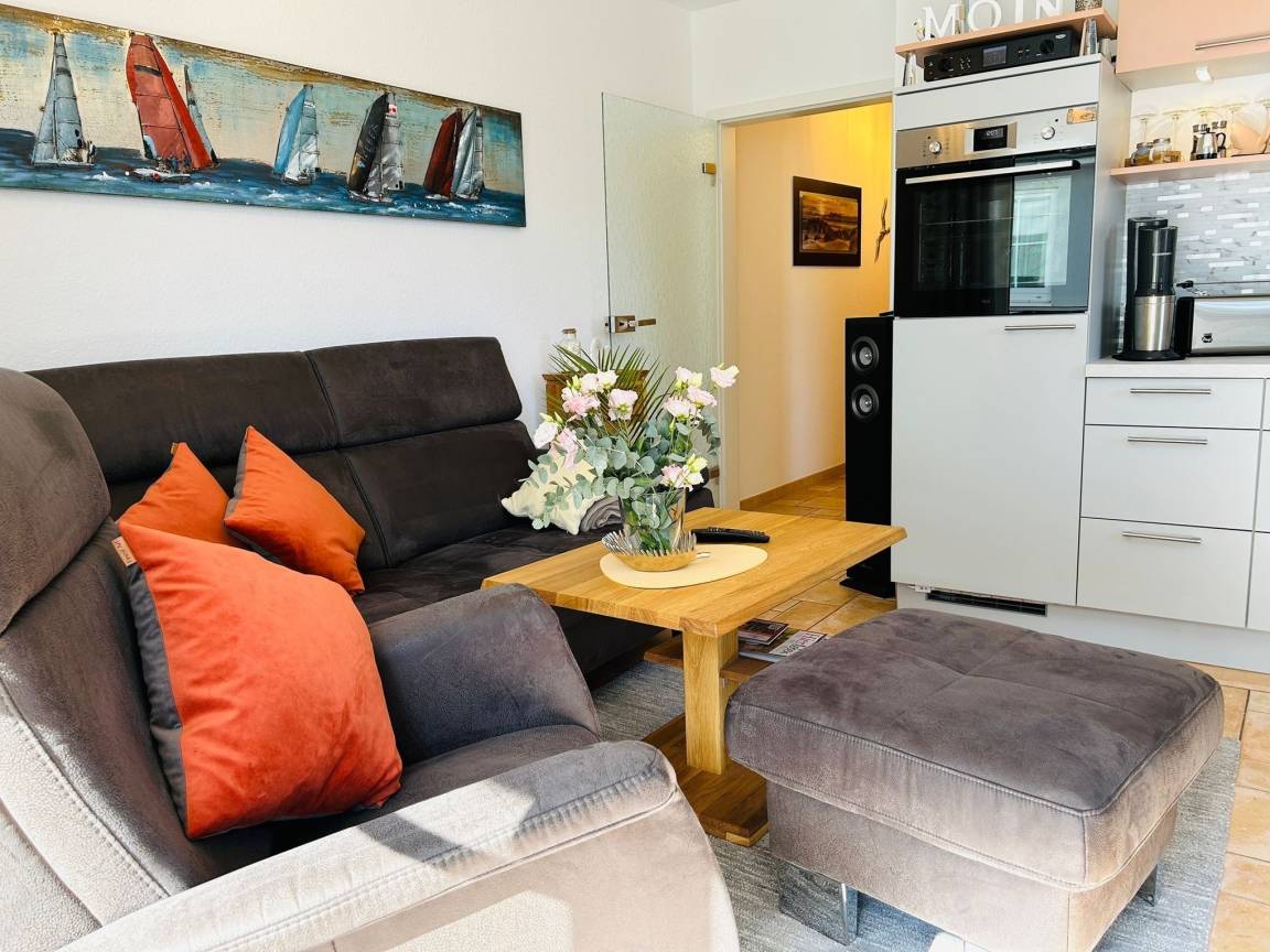 gemütliches Wohnzimmer mit kompletter Küchenzeile, Balkon 1 zur Süd-West-Seite mit Strandkorb, Balkon 2 zur Ostseite mit Gartenblick, Sat-TV (4k), Musikanlage mit Internetradio, unbegrenzter, schneller unlimitierter Gigabit- WLAN Zugang, BluRay Player, Geschirrspüler, Microwelle, Kaffeemaschine, Toaster, Esstisch mit 4 Barhockern (höhenverstellbar),