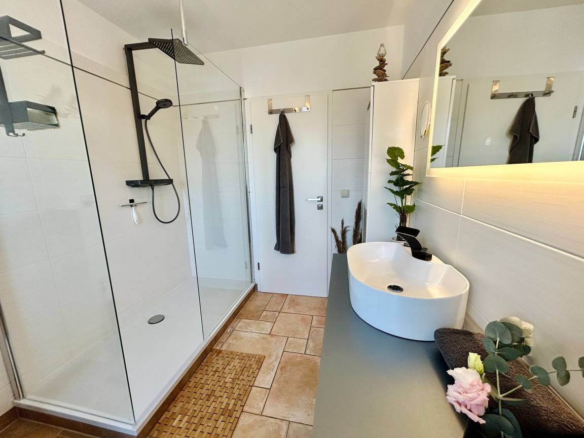hochwertiges Badezimmer mit Walk-In Regendusche, beleuchteter großer Spiegel, Waschmaschine und WC