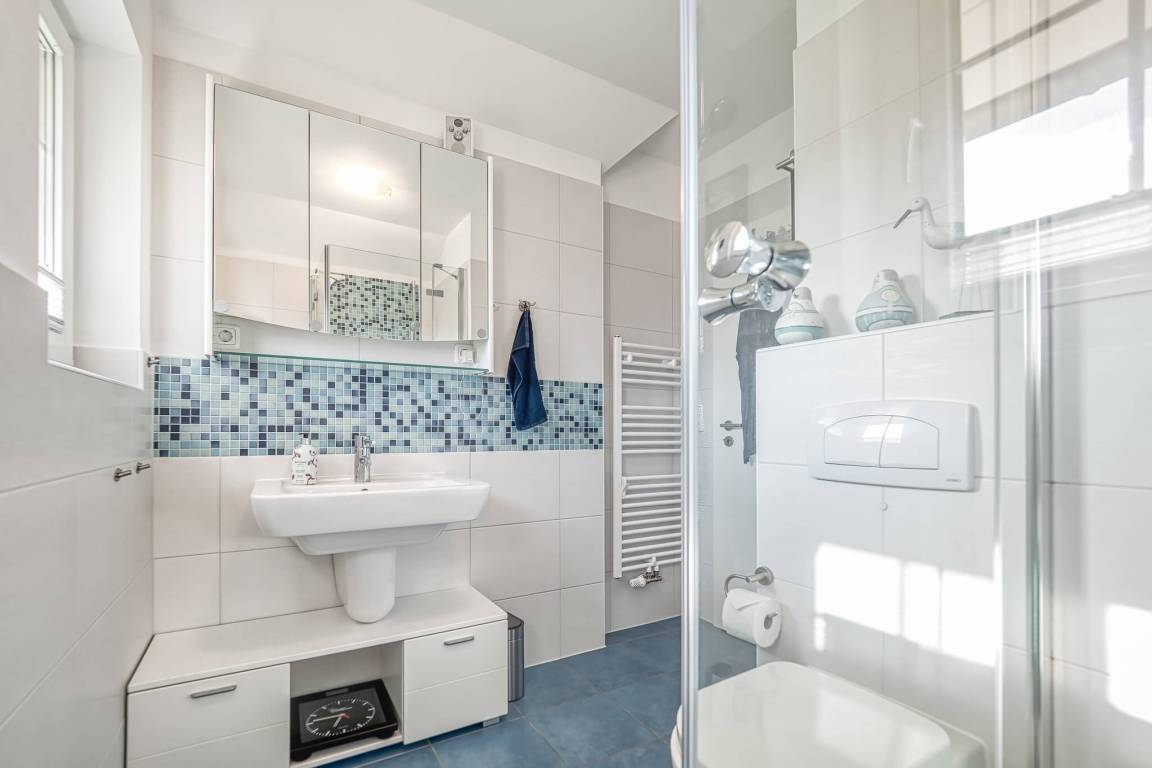 Im Obergeschoss befinden sich 2 Schlafräume und ein weiteres Bad (Dusche/WC).