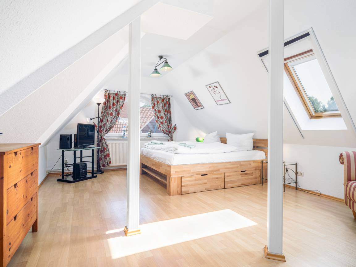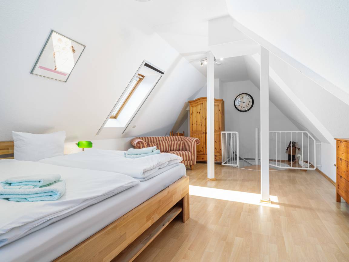 ein großzügig angelegtes Atelierschlafzimmer mit zweiter gemütlicher Sitzecke und Fernseher, ein weiteres Schlafzimmer mit Doppelbett,