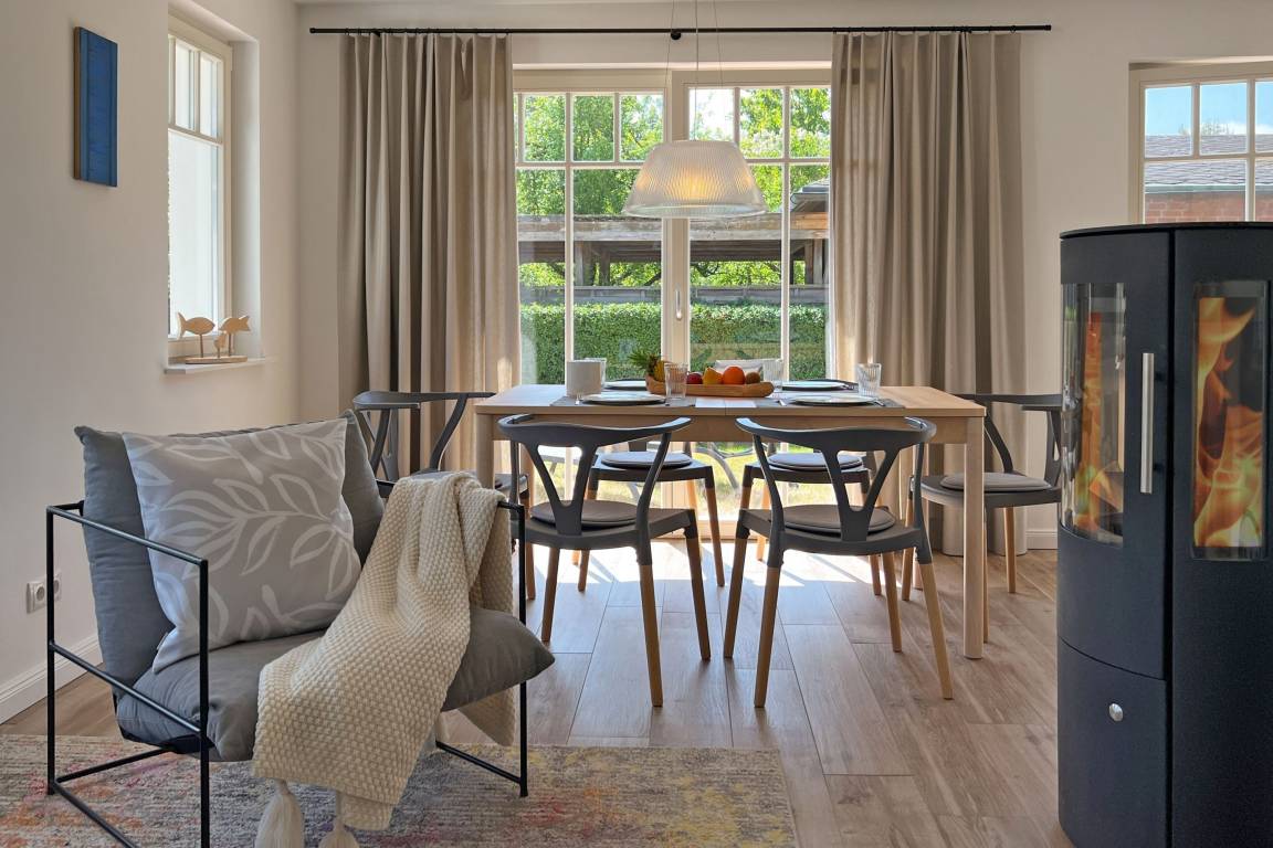 Das Ferienhaus Meeresbrise empfängt Sie mit einer warmen und einladenden Atmosphäre. Der großzügige Wohnbereich mit Kamin ist das Herz des Hauses und lädt zu entspannten Abenden ein – sei es bei einem guten Buch oder einem gemeinsamen Spieleabend. Die moderne Küche ist vollständig ausgestattet, sodass Sie mühelos köstliche Mahlzeiten für Ihre Liebsten zubereiten können.
