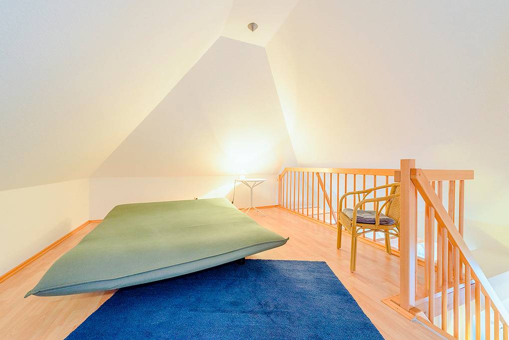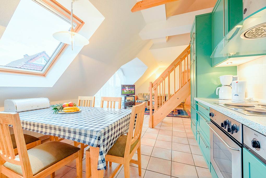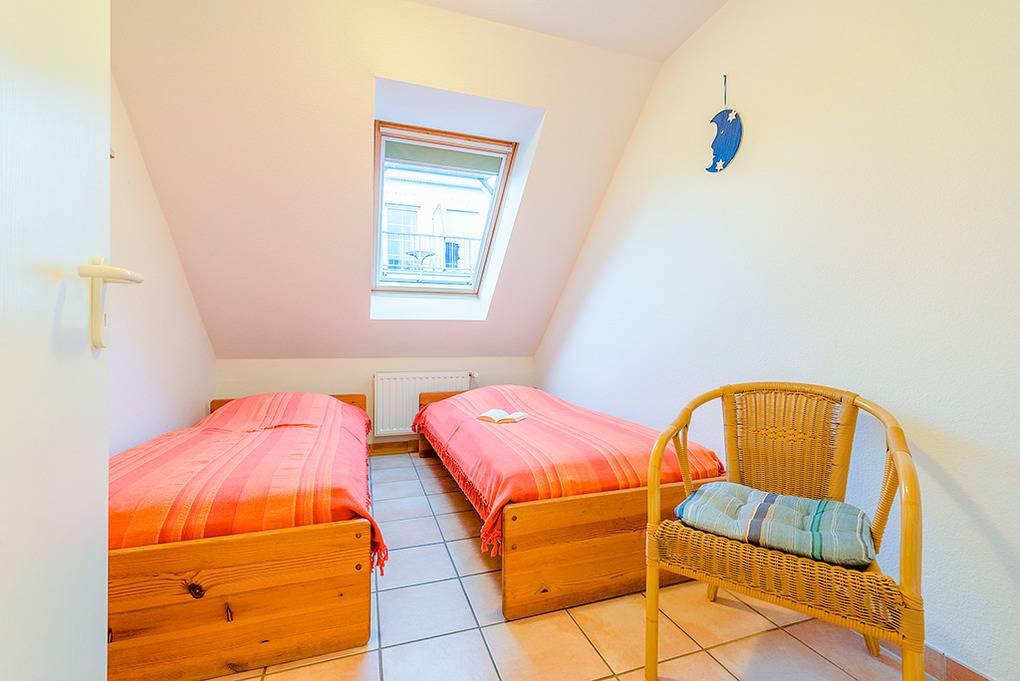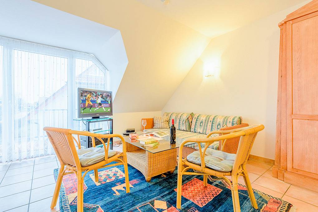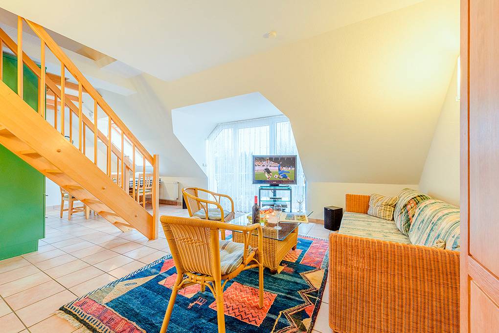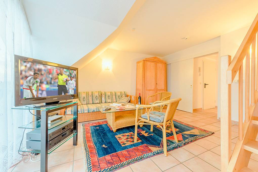 D 67.2212 Wohnung 1-6 Pers.: 3-Zimmerwohnung mit 70 qm Wohnfläche über 2 Etagen. 1. Etage. Nichtraucherwohnung. Wohn-/Essraum mit gemütlicher Couchgarnitur, Sat-TV, Esstisch, Küchenzeile (Backofen, Spülmaschine). Doppelzimmer. 2-Bettzimmer. Bad/WC. Separates WC. Treppe in die 2. Etage: Galerie, offen zum Wohnraum, mit Doppelbett. Balkon.