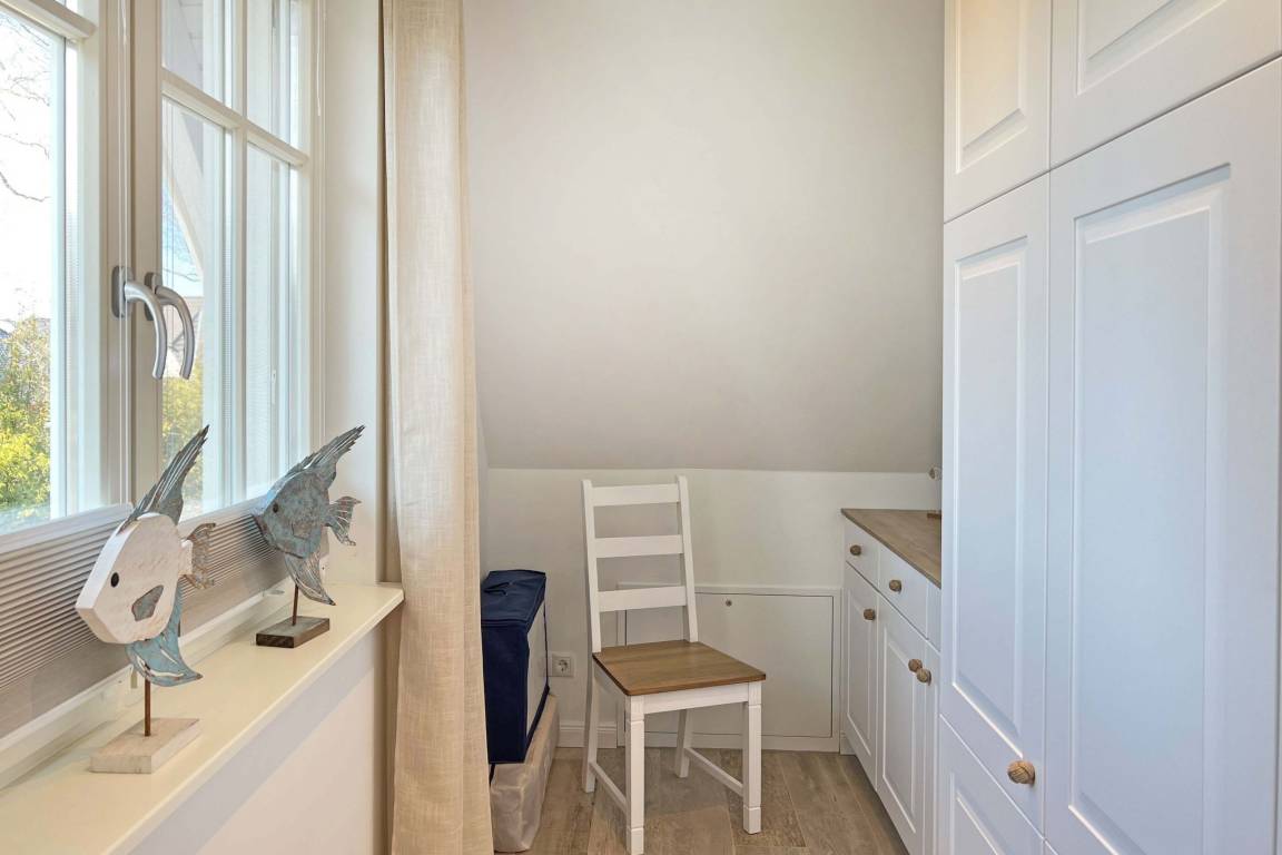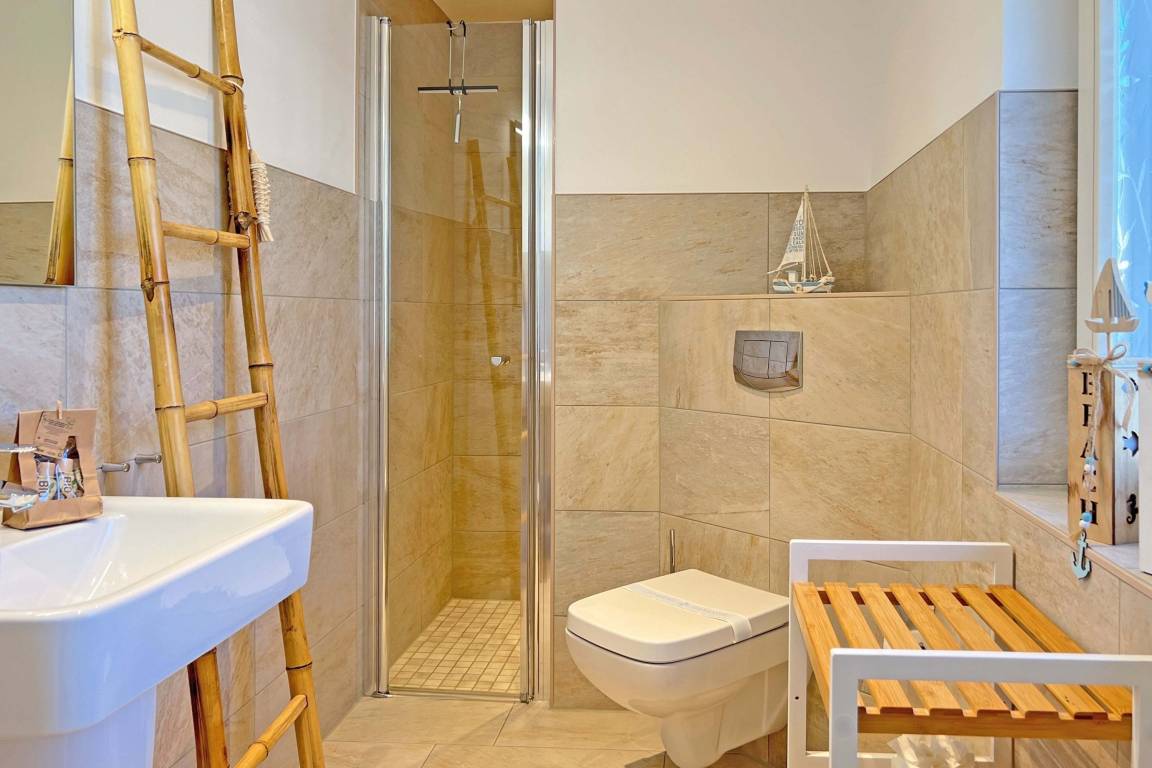 Im Obergeschoss finden Sie drei liebevoll eingerichtete Schlafzimmer, die mit Boxspringbetten und Fliegengittern ausgestattet sind. Verdunklungsmöglichkeiten sorgen für erholsamen Schlaf, während moderne Badezimmer mit Fußbodenheizung und ebenerdiger Dusche Komfort bieten.