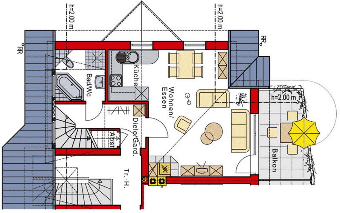 Die Ferienwohnung erstreckt sich über 2 Etagen, ca. 65 m² Wohnfläche mit Fußbodenheizung, offenem Kamin, großem Südbalkon mit Elektromarkise.