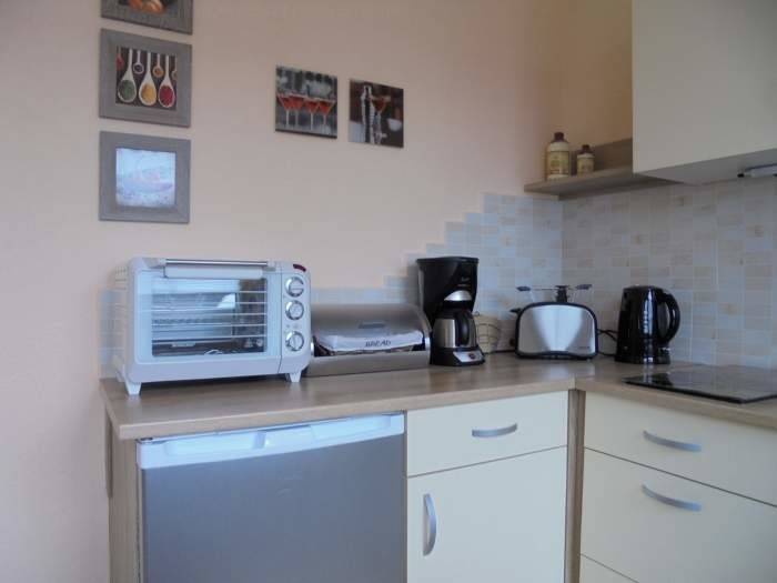 Das Wohnzimmer ist mit gemütlicher Sitzecke, SAT/TV, Radio sowie Internet/WLAN (einmalig 5.-€) ausgestattet. Im Schlafzimmer gibt es ein Doppelbett, eine Couch, einen Tisch und Sessel. In der integrierten Küchenzeile finden Sie Geschirrspüler, Kühlschrank mit Gefrierfach, Ceran-Kochfeld, Minibackofen, Kaffeemaschine, Wasserkocher, Eierkocher, Toaster, Geschirr und noch vieles mehr. Das kleine Bad verfügt über ein WC, eine Dusche, sowie ein Föhn.Das Apartment befindet sich in einer ruhigen Lage und Restaurants und Einkaufsmöglichkeiten kann man gut zu Fuß erreichen. Im Ostseeheilbad gibt es ca. 40 Gaststätten, die für jedermanns Geschmack etwas zu bieten haben.