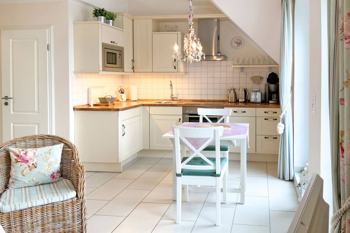 Die Ferienwohnung Rosenblüte empfängt Sie mit einer stilvollen und einladenden Atmosphäre. Der offene Wohn- und Essbereich ist geschmackvoll eingerichtet und bietet den perfekten Ort für entspannte Abende. Die voll ausgestattete Einbauküche verfügt über moderne Geräte wie Mikrowelle, Elektroherd mit Backofen und Ceranfeld sowie einen Geschirrspüler, sodass Sie mühelos kulinarische Köstlichkeiten zubereiten können.