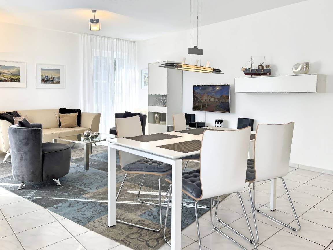 Heller Wohn- und Essbereich mit bequemer Sitzgruppe und Flachbild-TV