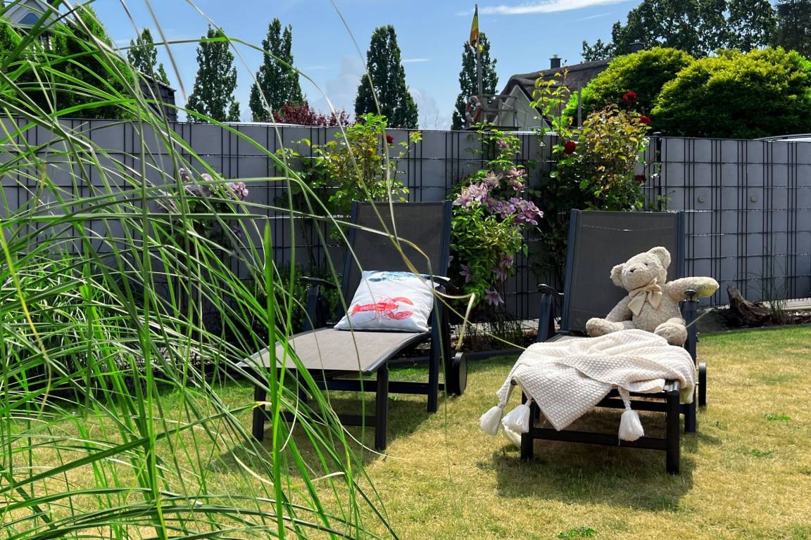 Sonnige Südterrasse mit Garten, Spielfläche für Kinder und eigenem Strandkorb