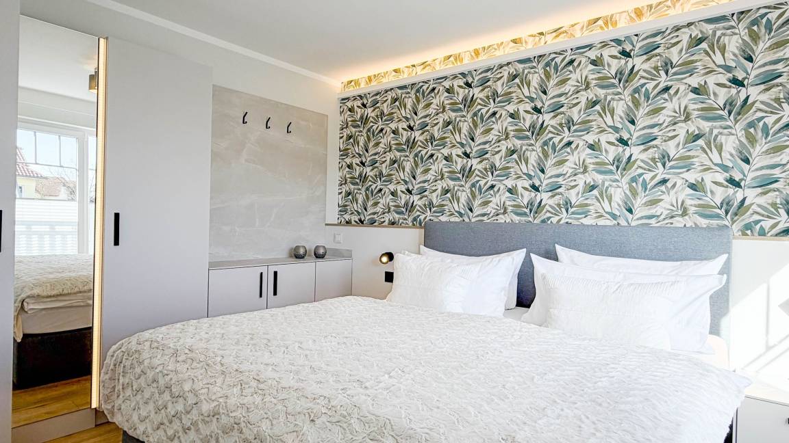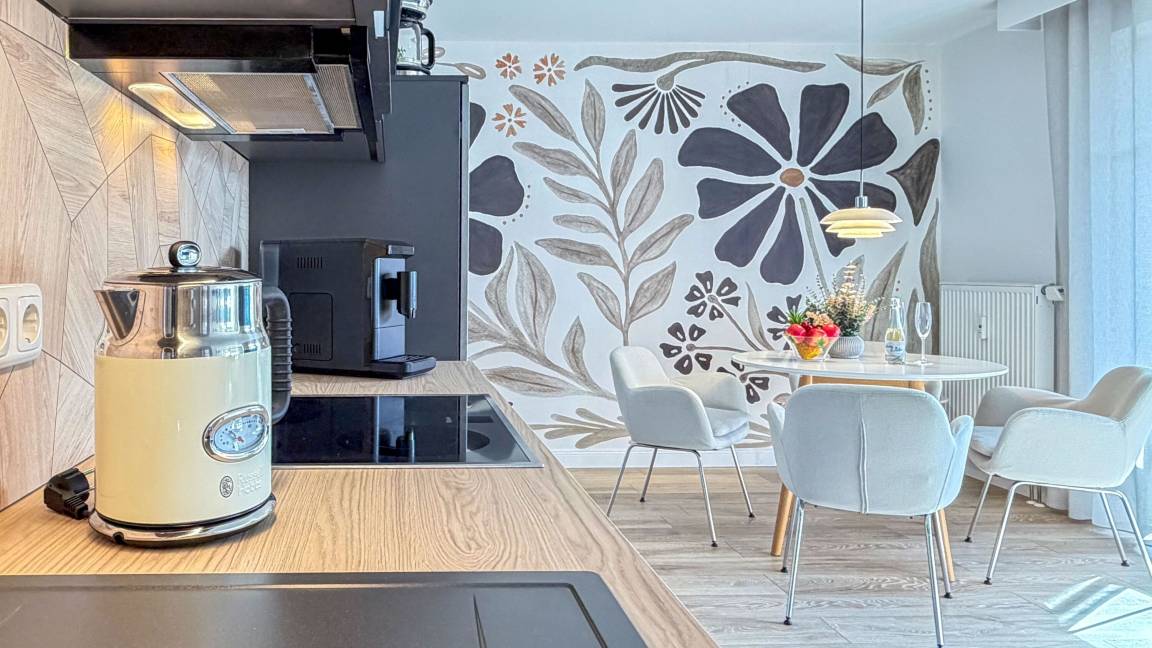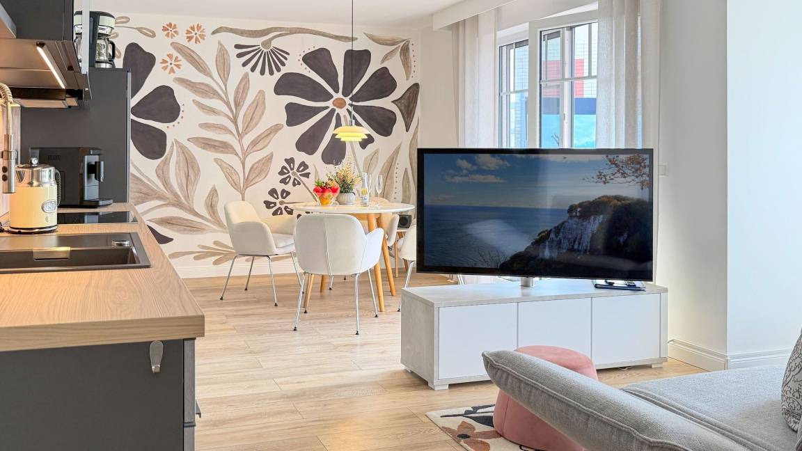 Die Ferienwohnung empfängt Sie mit einer modernen, lichtdurchfluteten Atmosphäre und künstlerischen Details wie der großflächigen Wandgestaltung. Hier wurde an alles gedacht: Vom Ganzkörperspiegel mit Beleuchtung bis hin zur technischen Vollausstattung. Ob beim ausgiebigen Frühstück auf dem Sonnenbalkon oder nach einem langen Spaziergang am Meer – in der Villa Seeluft 3 finden Sie Ruhe und Stil in perfekter Harmonie.