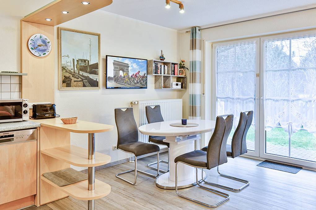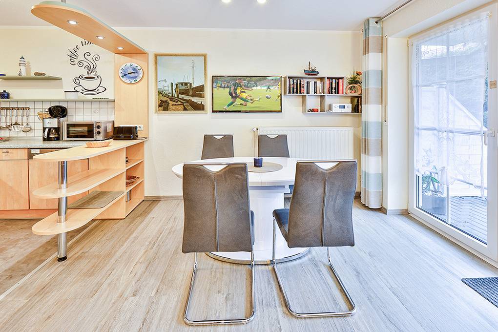 Haus: Schöne, moderne Reihenhäuser mit jeweils 5 Ferienwohnungen. Freundliche, geschmackvolle Einrichtung. Jede Fewo mit Sat-TV, Spülmaschine, Waschmaschine. Kostenloser Internetanschluss über W-Lan. Zentralheizung. Größtenteils mit Terrasse oder Balkon. 1 Pkw-Stellplatz /Fewo.