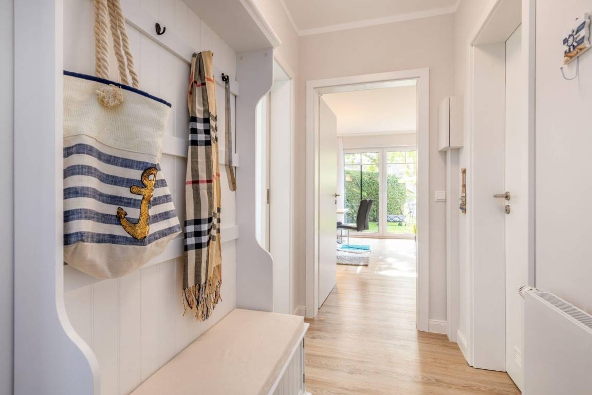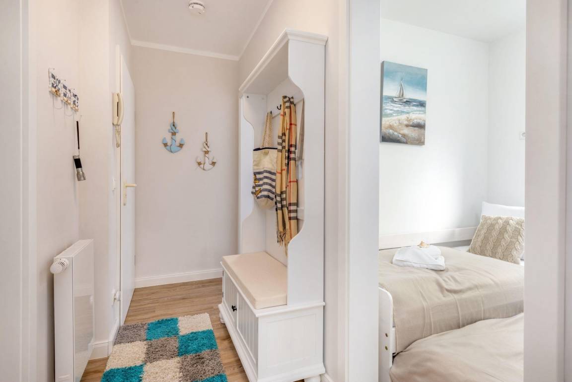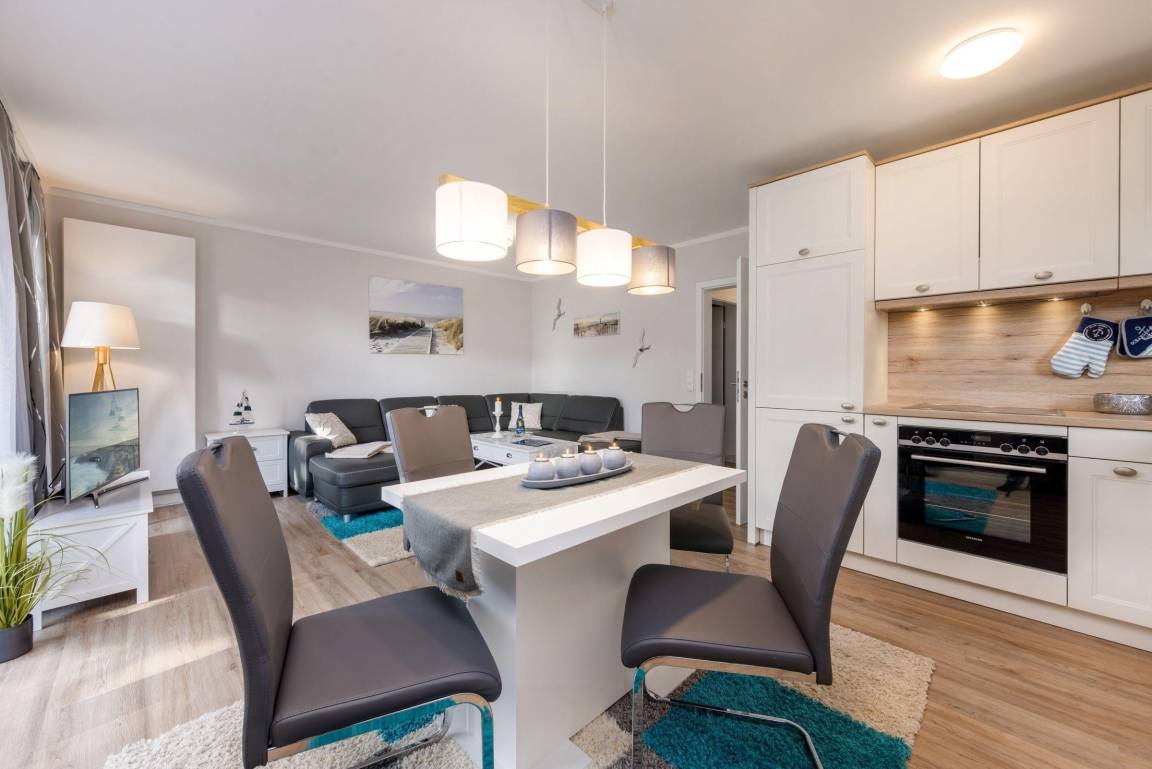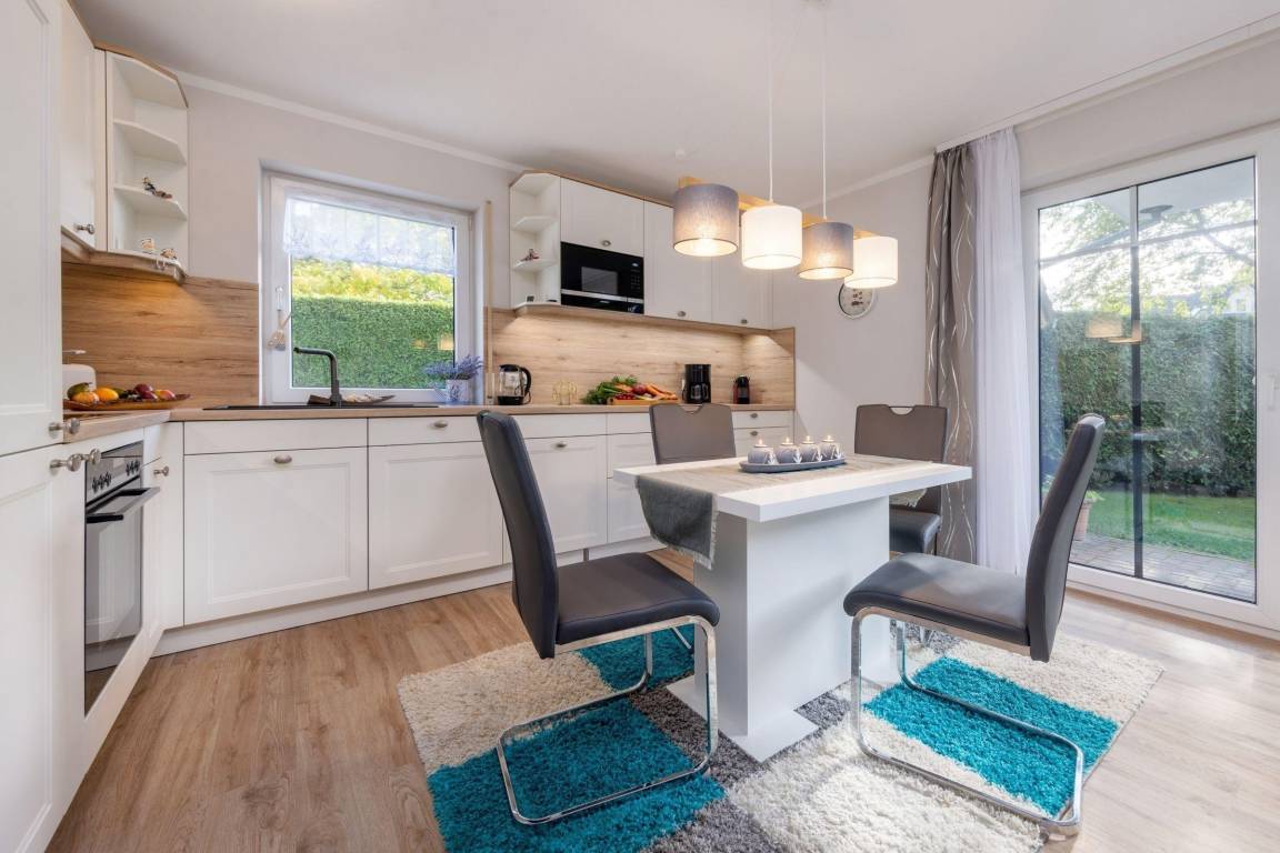 Die Ferienwohnung FeWo Bianca in Zingst erstreckt sich über 63 m² und bietet Platz für bis zu vier Personen. Die moderne und gepflegte Ausstattung umfasst ein separates Wohnzimmer mit einer gemütlichen Sofaecke, TV und kostenfreiem WLAN. Die offen gestaltete Küche ist mit einem Induktionsherd, Backofen, Mikrowelle, Kühlschrank mit Gefrierfach, Spülmaschine sowie weiteren Geräten ausgestattet. Zwei Schlafzimmer, eines mit Doppelbett (180x200) und ein weiteres mit ausziehbarem Einzelbett (90x200), sorgen für komfortable Schlafmöglichkeiten. Das Badezimmer bietet eine bodengleiche Dusche, Waschbecken und Haartrockner. Für Familien stehen praktische Ausstattungen wie ein Kinderhochstuhl und Steckdosensicherungen zur Verfügung. Ein privater Parkplatz sowie eine eigene Waschmaschine gewährleisten zusätzlichen Komfort. Haustiere sind nach vorheriger Anfrage willkommen. FeWo Bianca steht für einen entspannten Aufenthalt im Ostseeheilbad Zingst.