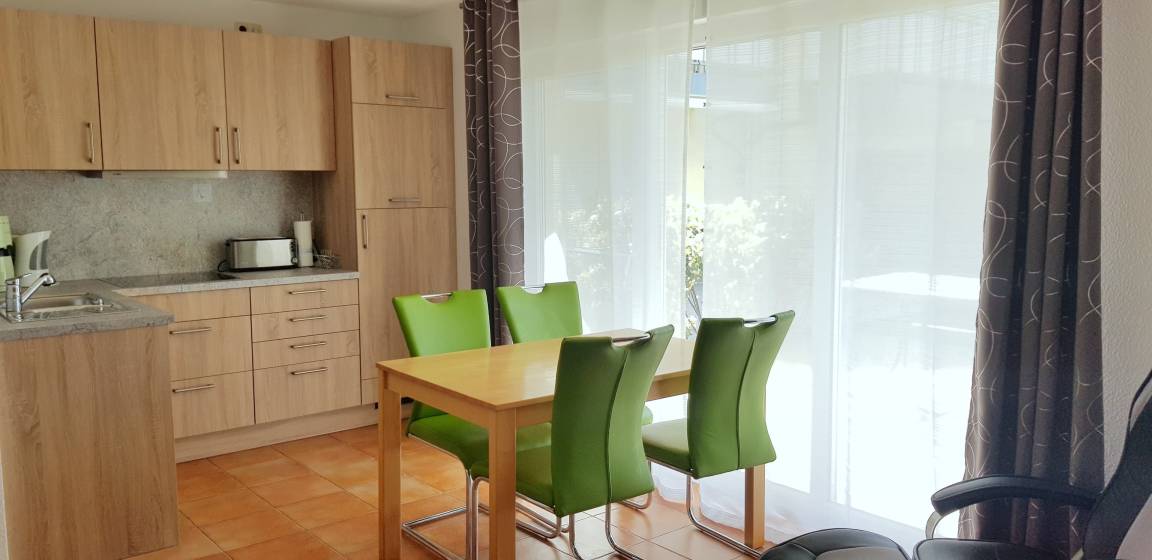 In dem gemütlich eingerichtetem Wohnzimmer stehen Ihnen ein LCD-TV, eine Nintendo und Bücher zur Verfügung. Auf gleicher Ebene befindet sich eine große Küche, ausgestattet mit Kühlschrank (incl. Gefrierfach), Geschirrspüler, Cerankochfeld, und div. Elektrogeräten (Kaffeemaschine, Wasserkocher, Toaster).