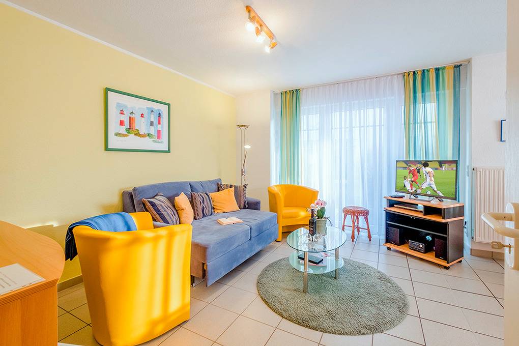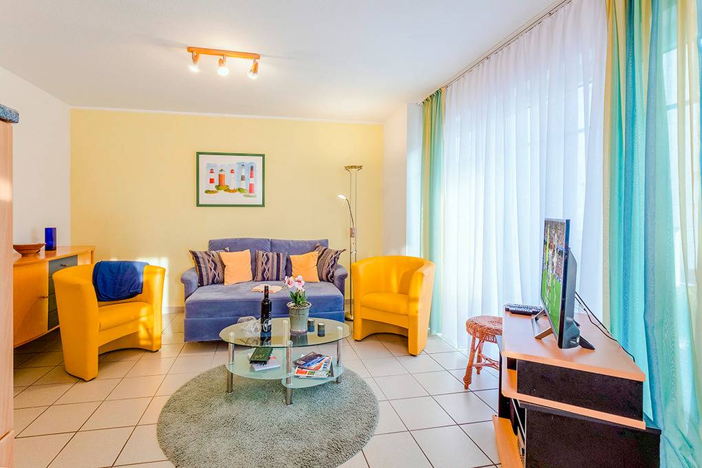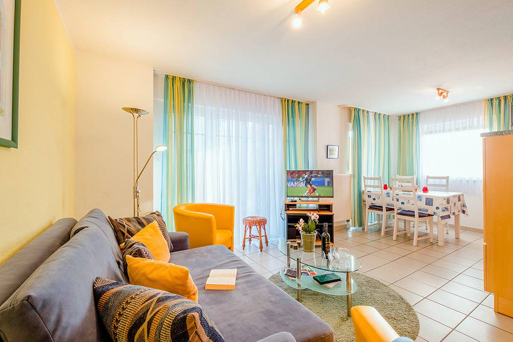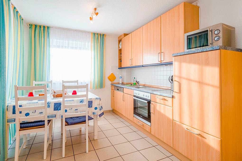 D 67.1611 Wohnung 1-4 Pers.: 3-Zimmerwohnung mit 60 qm Wohnfläche, Parterre. Wohn-/Essraum mit Couchgarnitur, Flachbild-Sat-TV, DVD-Player, Esstisch, moderner Küchenzeile (Backofen, Mikrowelle, Spülmaschine). Zwei Doppelzimmer, eins davon mit franz. Bett. Bad: Du, Wb, WC, Waschmaschine, Trockner. Terrasse.