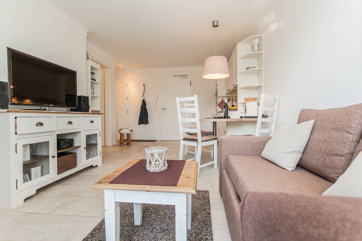 Die Ferienwohnung ist ausgestattet mit einem Wohnraum mit Schlafsofa (ca.1,20m x 2,00 m), einer komplett eingerichteten Küchenzeile inkl. Nespressomaschine. Einem Schlafzimmer mit Boxspringbett (1,60 m x 2,00 m) und einem Badezimmer mit ebenerdiger Dusche (Regendusche und Handbrause) und WC.