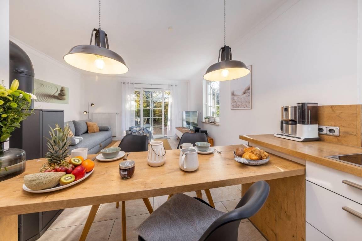 Die komfortable Ferienwohnung „Whg. Dynamique" bietet auf 55 m² Platz für bis zu drei Personen und erfüllt sowohl moderne als auch allergikerfreundliche Ansprüche. Der offen gestaltete Wohn- und Essbereich ist mit einem hochwertigen Schlafsofa, TV, HiFi-Anlage und Kaminofen ausgestattet und unterstützt gemütliche Abende. Die voll ausgestattete Küche verfügt über ein Induktionsherd, Backofen, Spülmaschine und diverse Küchenutensilien. Ein separates Schlafzimmer bietet ein Doppelbett (180x200) und TV. Das moderne Bad ist mit einer bodengleichen Dusche ausgestattet. Waschmaschine, Wäscheständer und Bügelmöglichkeiten stehen zur Selbstnutzung bereit. In der Tiefgarage kann ein Parkplatz (max. 2 m Durchfahrtshöhe) genutzt werden, zudem gibt es einen abschließbaren Fahrradraum mit E-Bike-Lademöglichkeit. Die Wohnung ist ein Nichtraucherbereich und eignet sich hervorragend für einen entspannten Aufenthalt in Zingst.