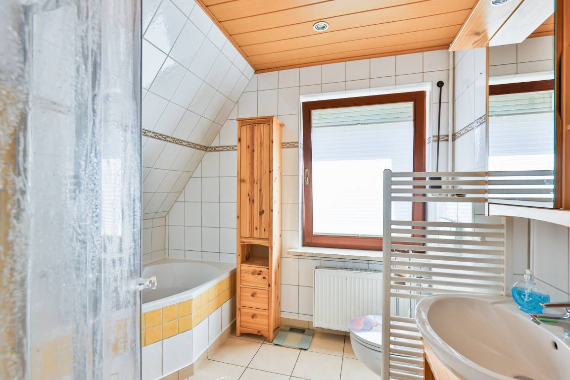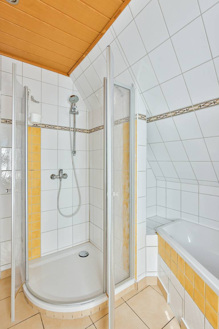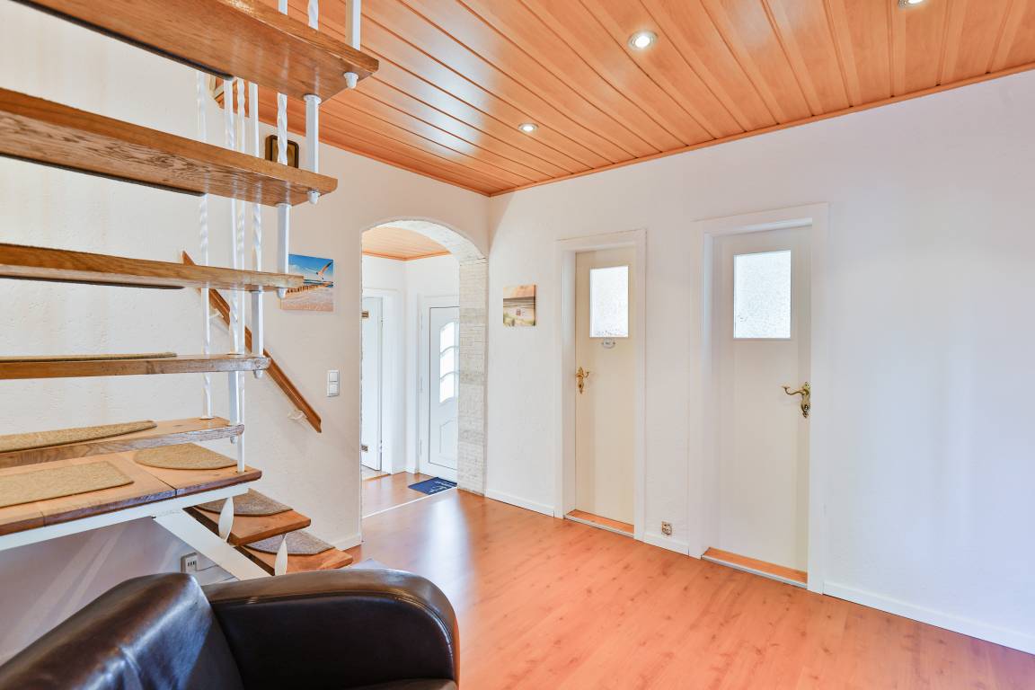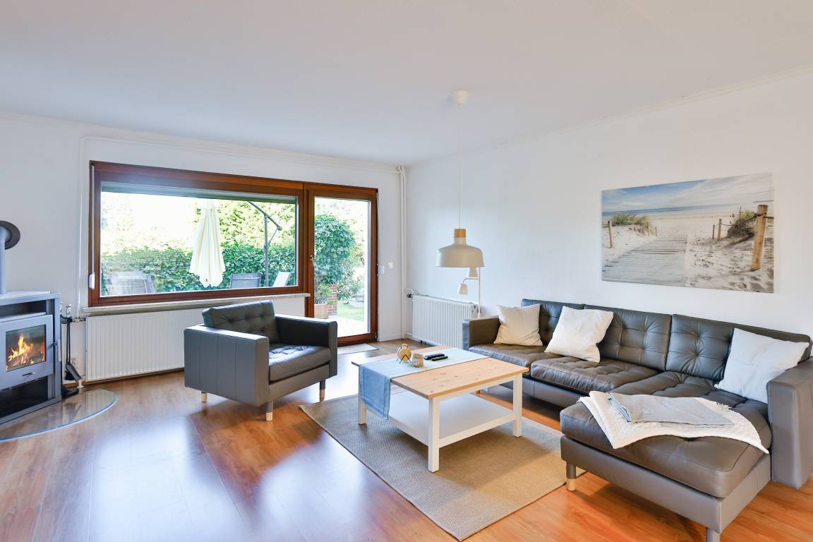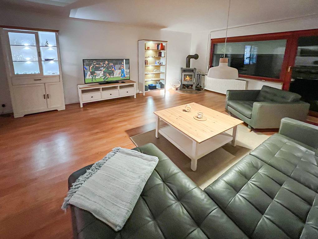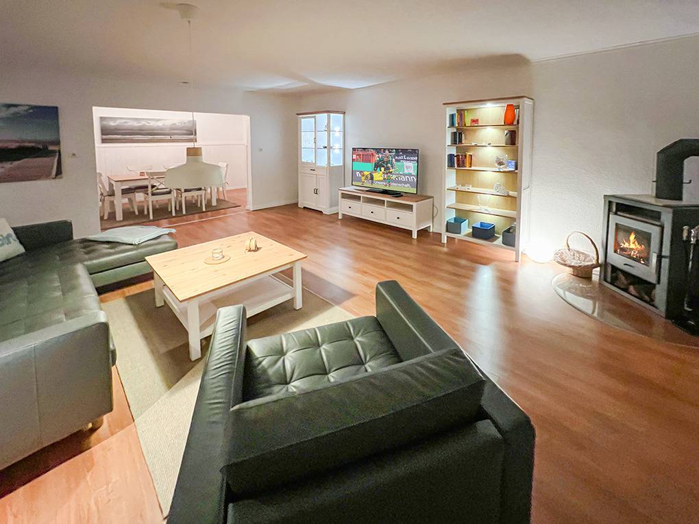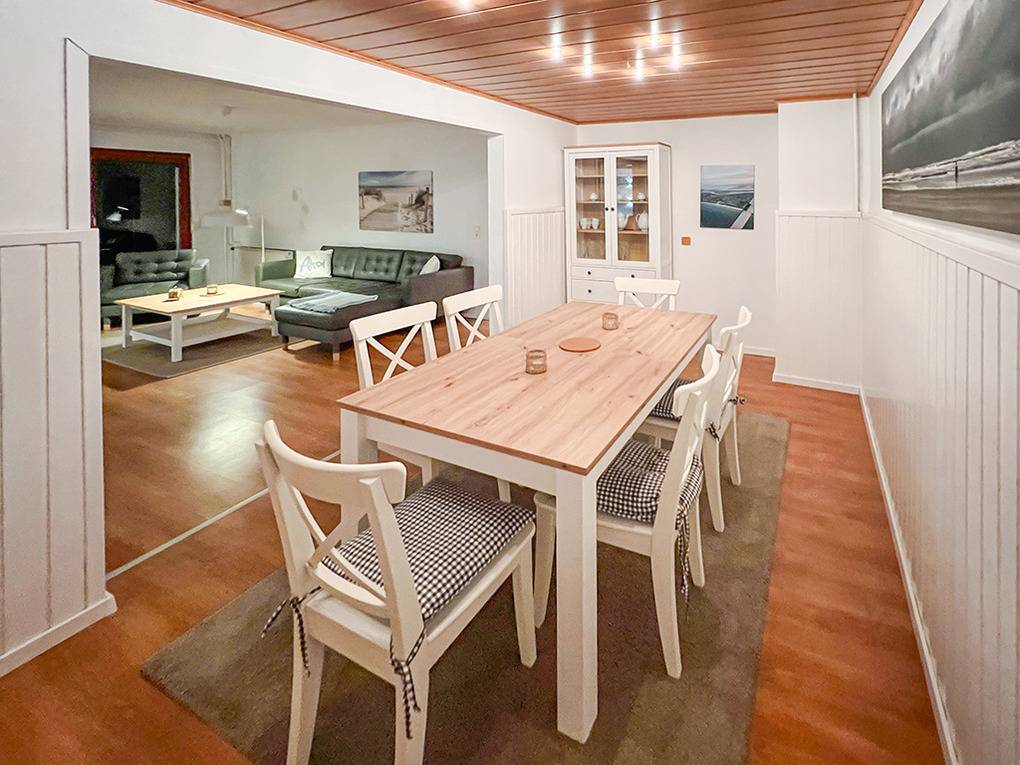 D 67.108 Ferienhaus 1-6 Pers.: Komfortables 4 ½ -Zimmerhaus mit 123 qm Wohnfläche über 2 Etagen. Parterre: Heller Wohn-/Essraum mit Couchgarnitur, Kaminofen, Smart-TV (Sat-TV), gemütlicher Essbereich mit Esstisch. Separate Küche mit kleinem Esstisch, gut ausgestatteter Einbauküche mit Backofen, Mikrowelle, Spülmaschine. Kleines Bad: Wb, WC. 1. Etage: Großes Doppelzimmer. Weiteres Doppelzimmer. Kleines Doppelzimmer mit französischem Bett (140 x 200 cm). Bad: Du, Bw, Wb, WC.